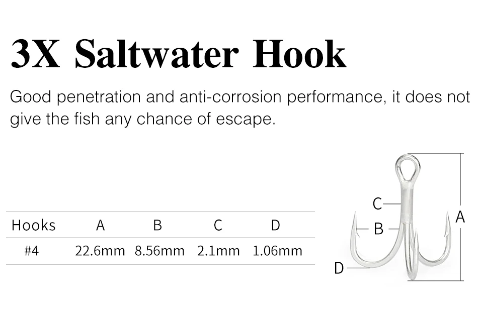 3X ganchos de agua salada. Con buena penetración y rendimiento anticorrosión, no da al pez ninguna posibilidad de escapar.