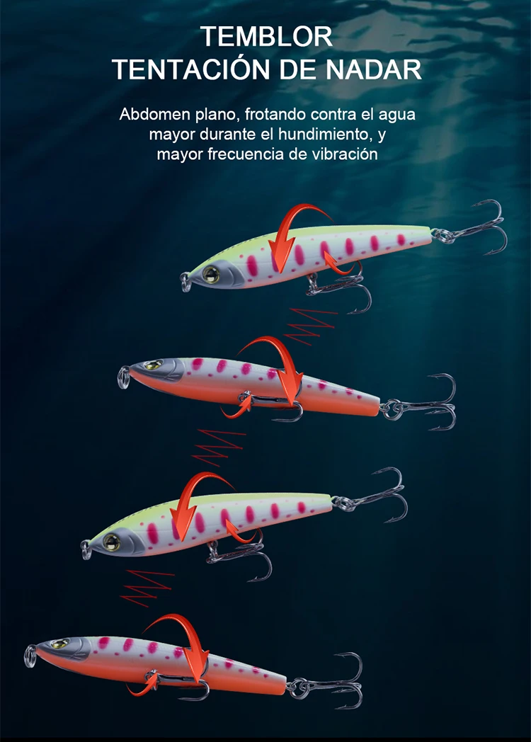 El señuelo está diseñado para producir fuertes vibraciones cuando se recupera, simulando una presa herida y atrayendo peces con su patrón de vibración efectivo.