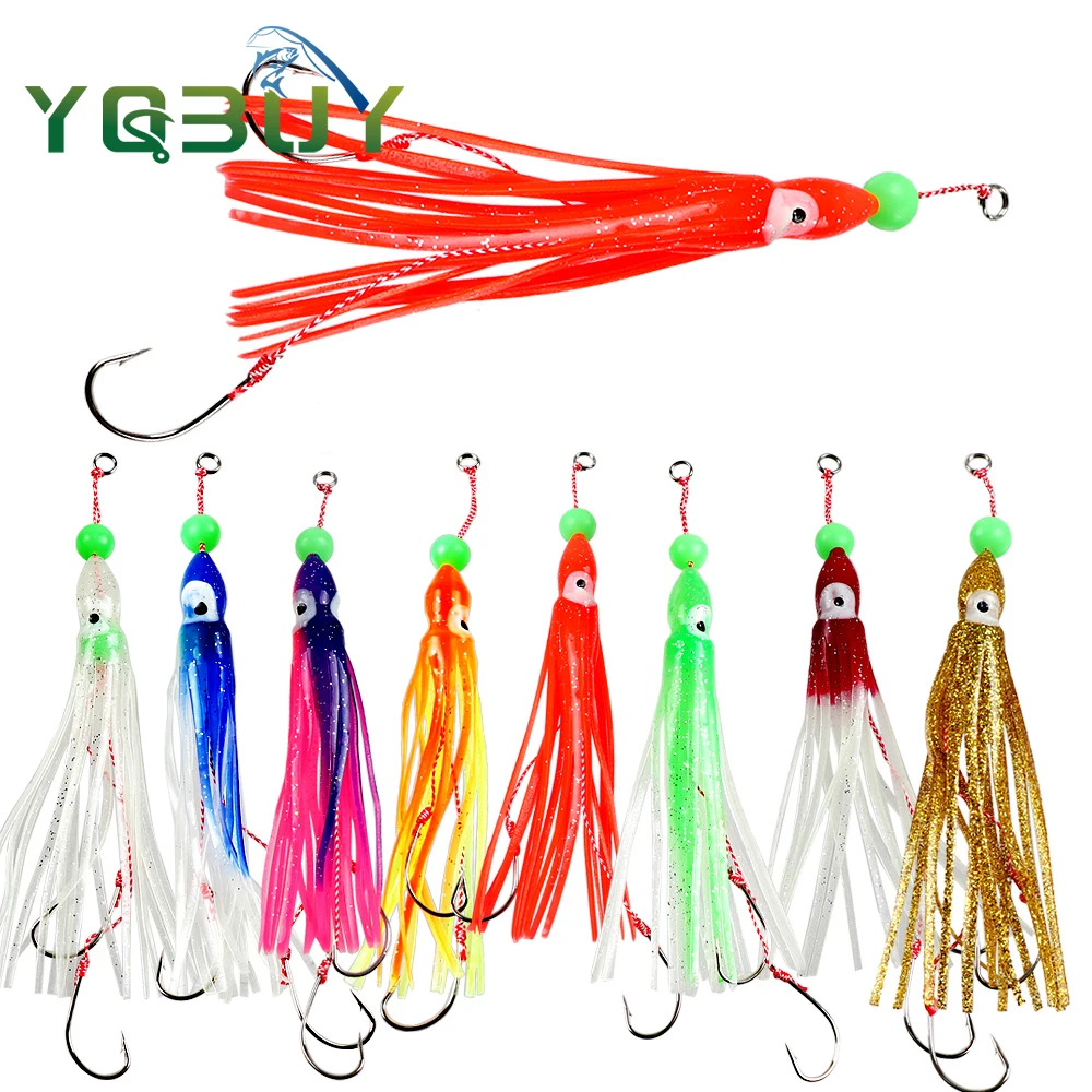 (3) su diseño Con fluorescente de todo el cuerpo, el cebo de falda de calamar atrae a los peces curiosos, mientras que el diseño grueso garantiza que el anzuelo esté oculto y le ayuda a aterrizar más peces.