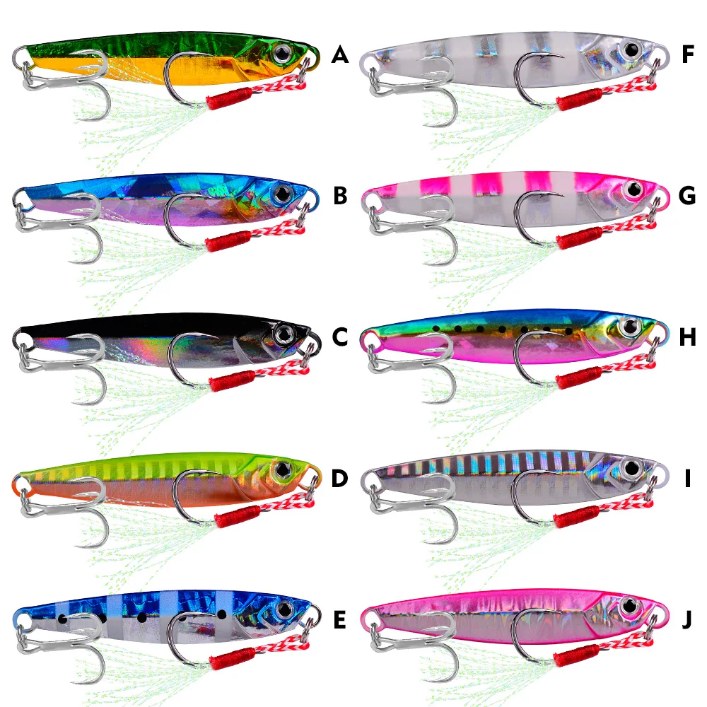 Colores: 6 colores disponibles Gancho triple fuerte y gancho de asistencia Peso (g) Longitud (cm) 7 4.7 10 5.3 14 6 17 6.3 21 6.7 La Plantilla de agua salada de metales fue diseñada para pescadores oceánicos que aman la pesca en botes profundos.