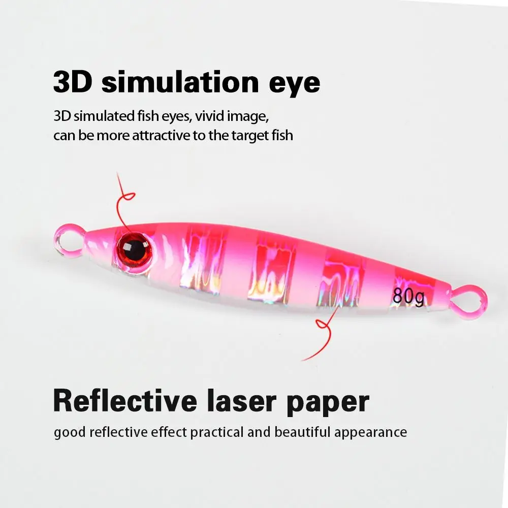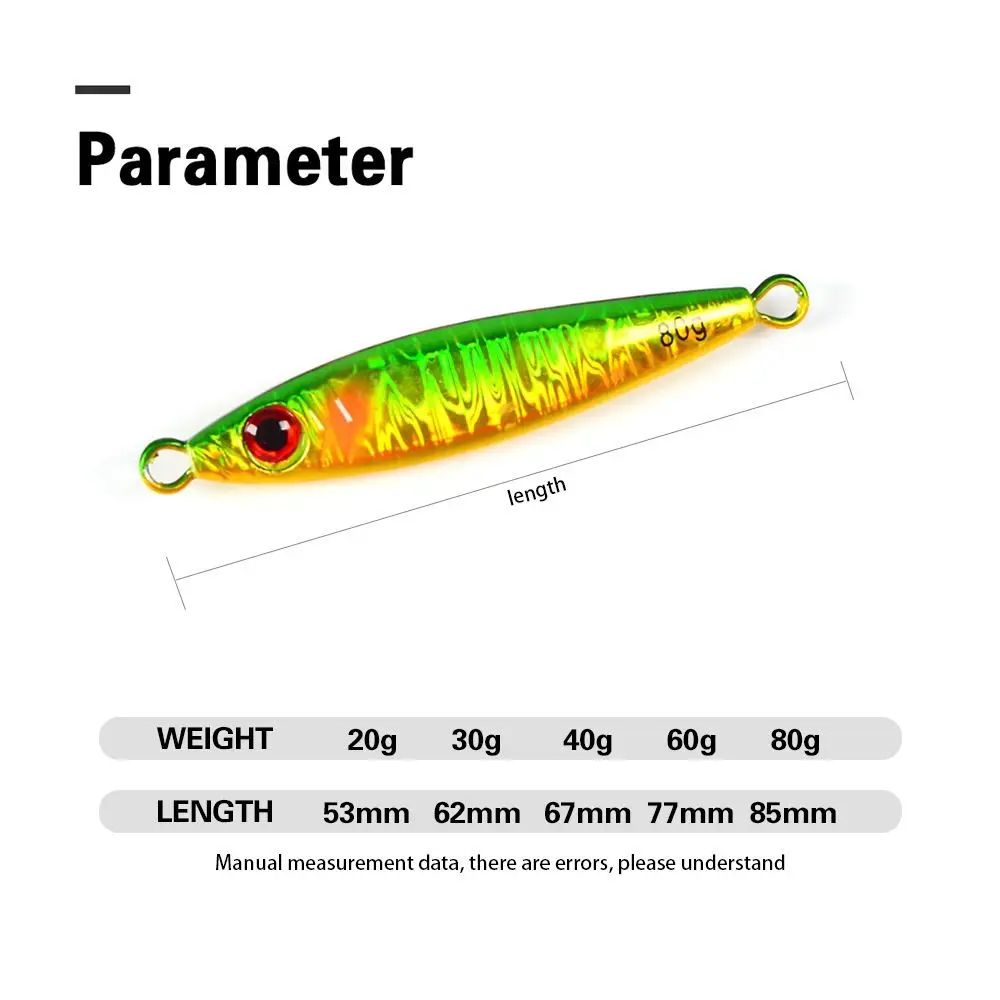 Tipo: señuelo de pesca Material: hierro Color: plata/Rosa/azul/verde Tamaño: 5,3 cm/8,5 cm Peso: 20g/ 80g Características: 1. Con ACCIÓN DE BUCEO suave y rápida, fácil de trabajar. Diseño todo en uno estratégico y equilibrado para una presentación informal, rápida y lenta bajo el agua. 2. Ampliamente utilizado en agua salada, brillante para una amplia gama de especies de peces, como trucha, atunes, aleta azul, aleta amarilla, pez rey, Cobia, Jacks, Jacks, bonitos, pargos, meros, etc. El paquete incluye: 1 señuelo de pesca (sin anzuelo). El producto puede tener un error de 1-2cm, y el color puede verse un poco diferente de la imagen, por favor entiéndalo.