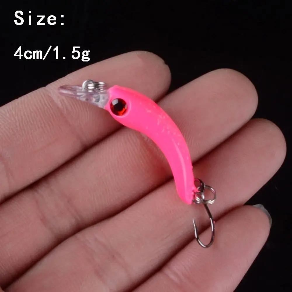 Tipo: Jig Bait Material: ABS Color: 8 colores opcionales Longitud: 4cm Peso: 1,5g Ganchos: Gancho DE ASISTENCIA doble Características: 1. El diseño del cebo tiene el mejor equilibrio, para que el cebo pueda nadar a la velocidad de recuperación más lenta posible. 2. El cebo se dibuja a la vida con ojos 3D vívidos, haciendo que el cebo parezca un pez real, nadando en el agua al pescar. 3. Anillo doble más fuerte: fortalece el anillo doble para aumentar la resistencia a la tracción, Y los afilados tres anzuelos de púas pueden ayudar a los entusiastas de la pesca a completar mejor la tarea de pescar.3 4.El anzuelo es muy afilado, ¡manténgalo fuera del alcance de los niños! El paquete incluye: 1 señuelo de pesca. Notas: El producto puede tener un error de 1-2cm y el color puede ser un poco diferente al de la imagen.