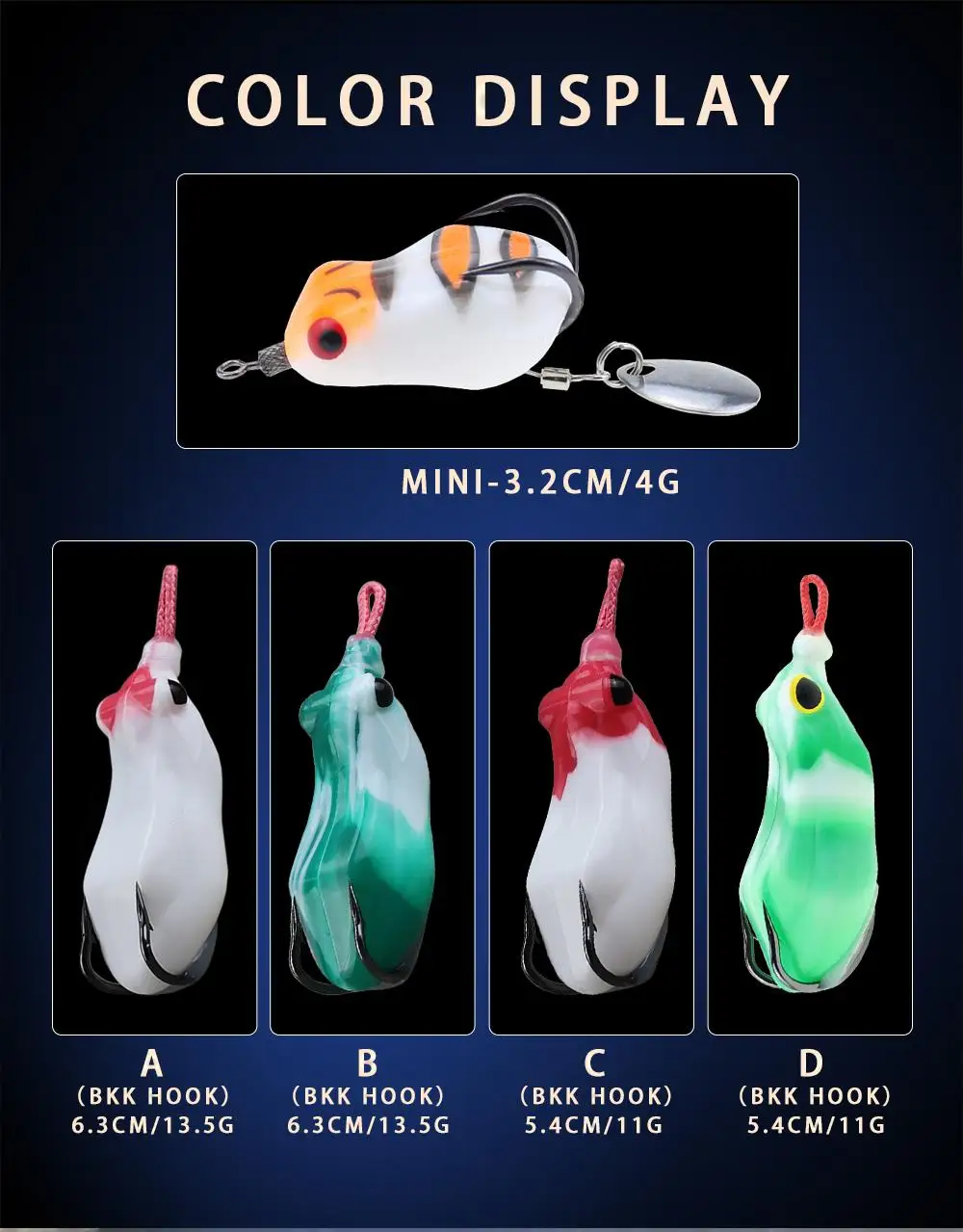 1. Colores de rana realistas: Cada señuelo de rana está diseñado para parecerse a las ranas reales que se encuentran en su lago y atraerá golpes violentos durante todo el año.