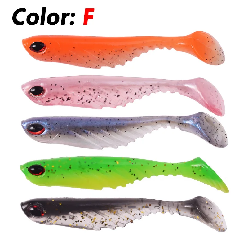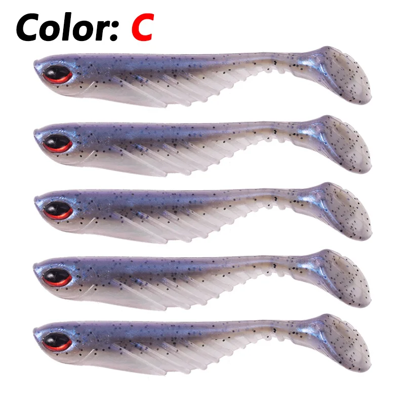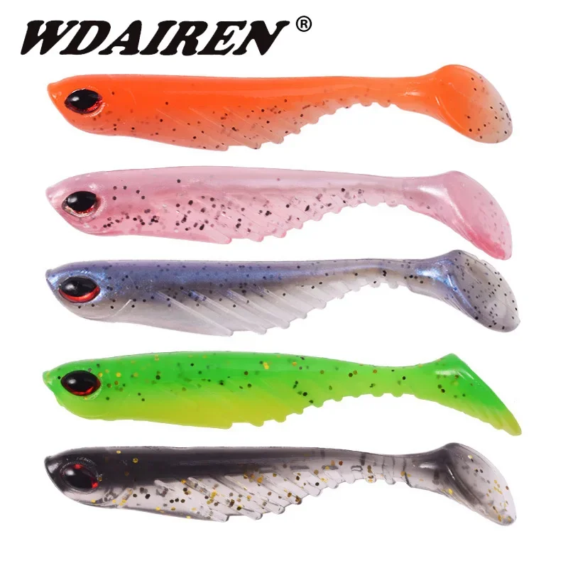 5 uds ojos 3D silicona cola en T cebo suave 7cm 2,8g doble Color goma Artificial Baiits lubina trucha Jigging Wobblers Señuelos de pesca