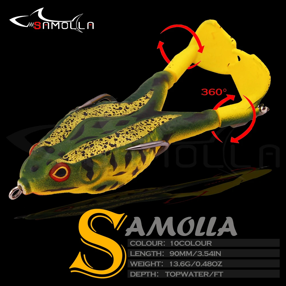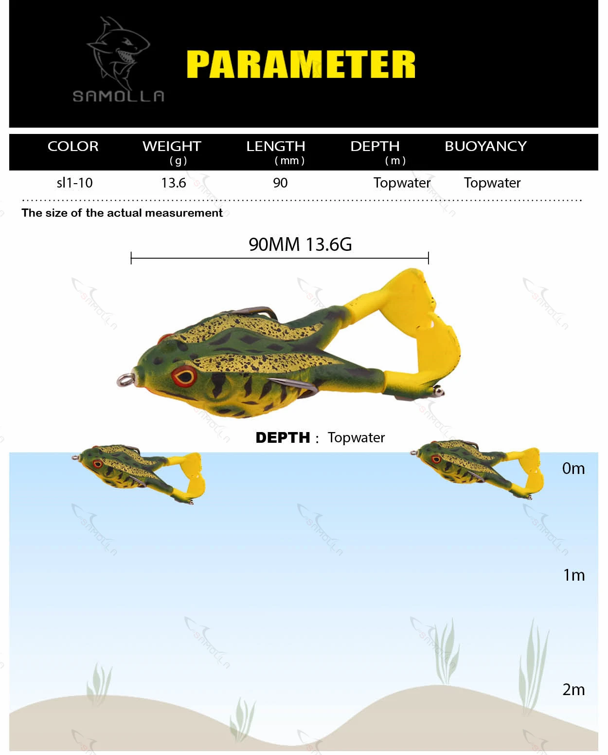 Detalles del producto: Marca: SAMOLLA Modelo de señuelo: SEÑUELO DE RANA Tipo de señuelo: señuelo de pesca suave Peso del señuelo: 13,6G Longitud del señuelo: 90mm Profundidad de buceo: Topwater Flotabilidad: Topwater Ganchos: equipados con ganchos anticorrosión de la marca: Ojos: ojos de pez 3D Anillos: bicíclicos Colores: 10 colores Características del producto: 1. El cuerpo del cebo adopta materiales avanzados de protección ambiental, no solo tiene una alta resistencia al impacto, sino que tampoco produce sustancias nocivas para el medio ambiente. 2. El cebo está diseñado para tener el mejor equilibrio para que el cebo pueda nadar a la velocidad de recuperación más lenta posible. 3. Los cebos tienen pintura realista y ojos 3D vívidos, hacen que el cebo parezca un pez real nadando en el agua durante la pesca. 4. Cuerpo colorido: Diseño de simulación, más atractivo para los peces. 5. Ganchos: anticorrosión, potencia más fuerte, duradero, agua de mar dulce universal. 6. Bolas de metal: Bolas de acero inoxidable en el interior, para mantener el equilibrio del señuelo de pesca, para la mayor distancia de lanzamiento. 7. Anillos bicíclicos más fuertes: fortalece el círculo doble y aumenta la resistencia a la tracción. 8. Simulación de piel de pez (láser): el diseño de la piel de pez de simulación la hace más atractiva para los peces grandes. 9. A diferencia de las populares uniones de ahorro realizadas por empresas populares. Bearking utiliza un proceso detallado que requiere mucho tiempo. 10. El acabado del borde y el proceso de desbarbado de precisión reducen el área apareada áspera de los señuelos a una superficie lisa. 11. Para probar la integridad de la adhesión, los señuelos se prueban con agua, sumergidos en agua caliente que excede los 70 grados durante unos 20 segundos.