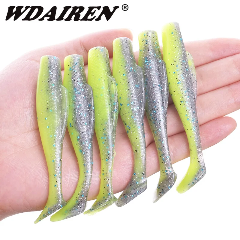 6 unids/lote cola T señuelo suave 80mm 5g flotador TPR cebo de silicona para pesca de Bajo mar Swimbait Jig Wobblers aparejo de goma Artificial