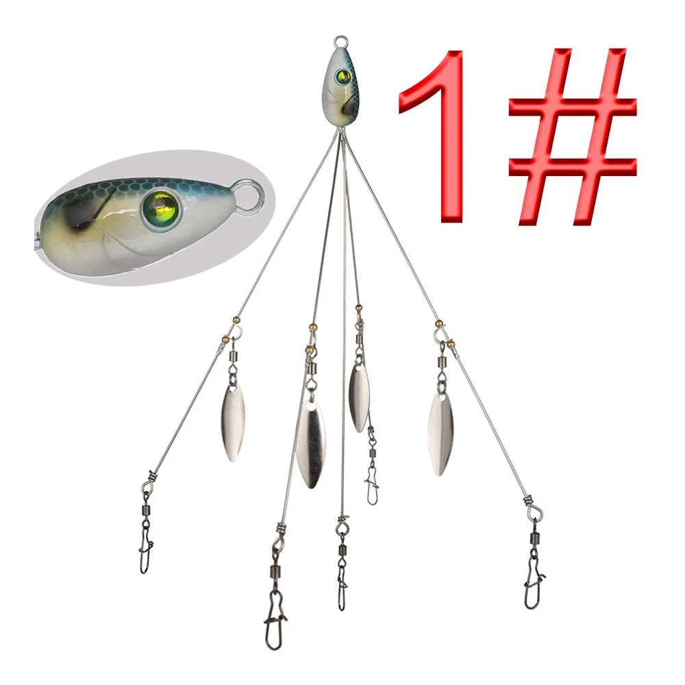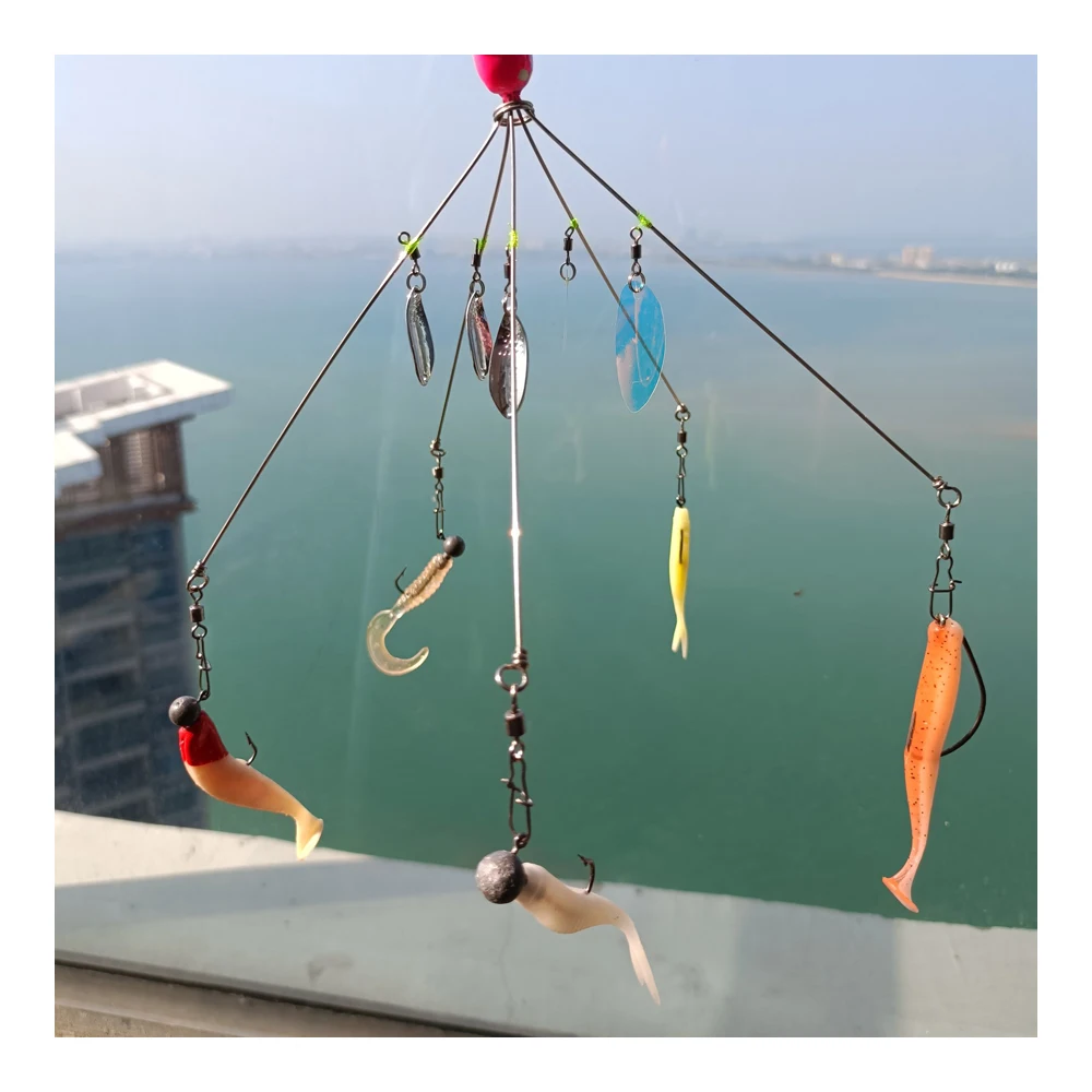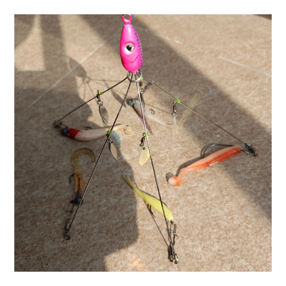 2.Gancho de manivela + cebo blando, anzuelo de plomo + cebo blando se pueden colgar en la parte inferior.Imita un grupo de peces pequeños en el agua y el efecto de atracción de peces es bueno.