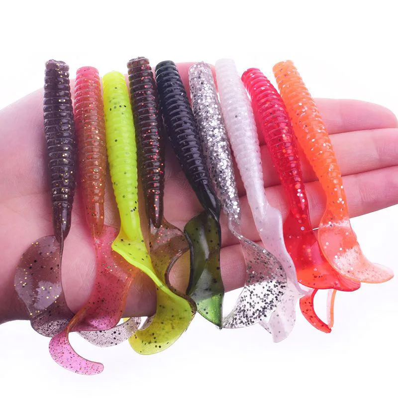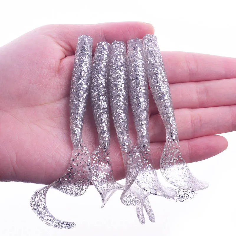 Señuelos blandos de silicona con olor a camarón, 8,5 cm, 4,5g, gusanos de cola larga, plantilla Wobblers, cebo de goma Artificial para pesca, trucha lubina