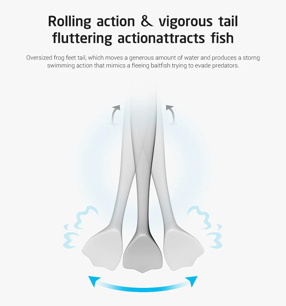 Cola de pata de rana de gran tamaño, que mueve una cantidad generosa de agua y produce una fuerte acción de natación que imita a un pez cebo que huye tratando de evadir a los depredadores.
