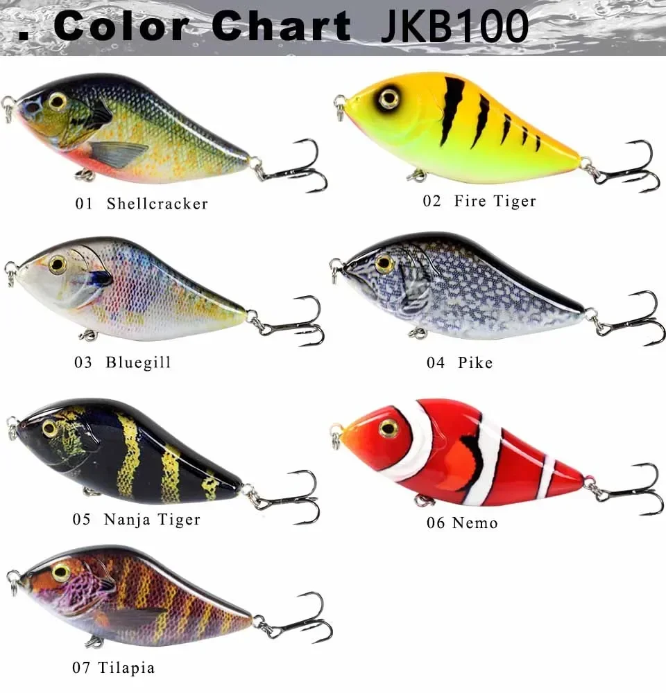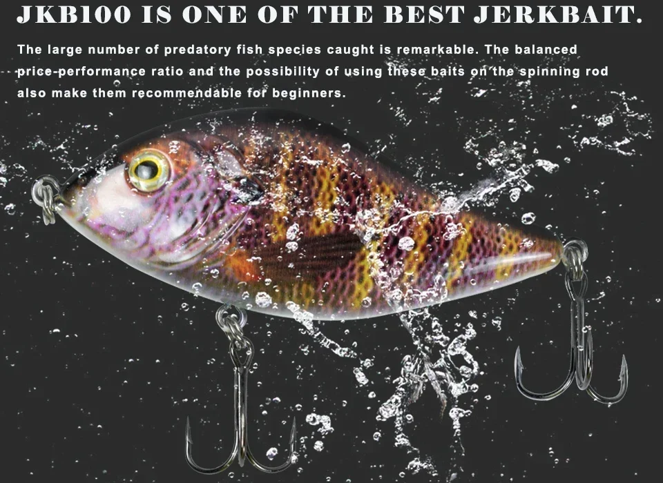 JKB100 slide jerkbait es el jerkbaits de mayor éxito desde hace años.La gran cantidad de especies de peces depredadores capturadas es notable.La relación precio-rendimiento equilibrada y la posibilidad de utilizar estos cebos en la caña giratoria también los hacen recomendables para principiantes.