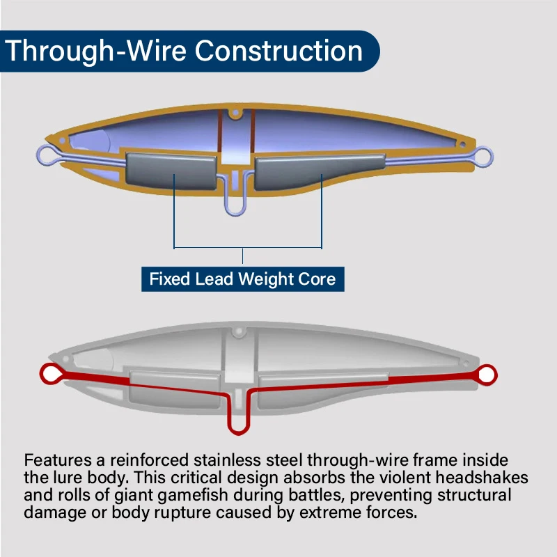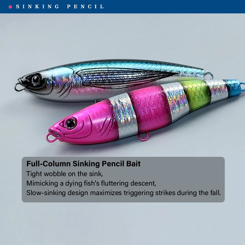 Lanzamiento ultralargo y hundimiento controlado: Diseñado para una máxima distancia de lanzamiento y una acción de hundimiento horizontal única que imita un pez cebo moribundo, provocando golpes explosivos de depredadores de aguas profundas durante el descenso.
