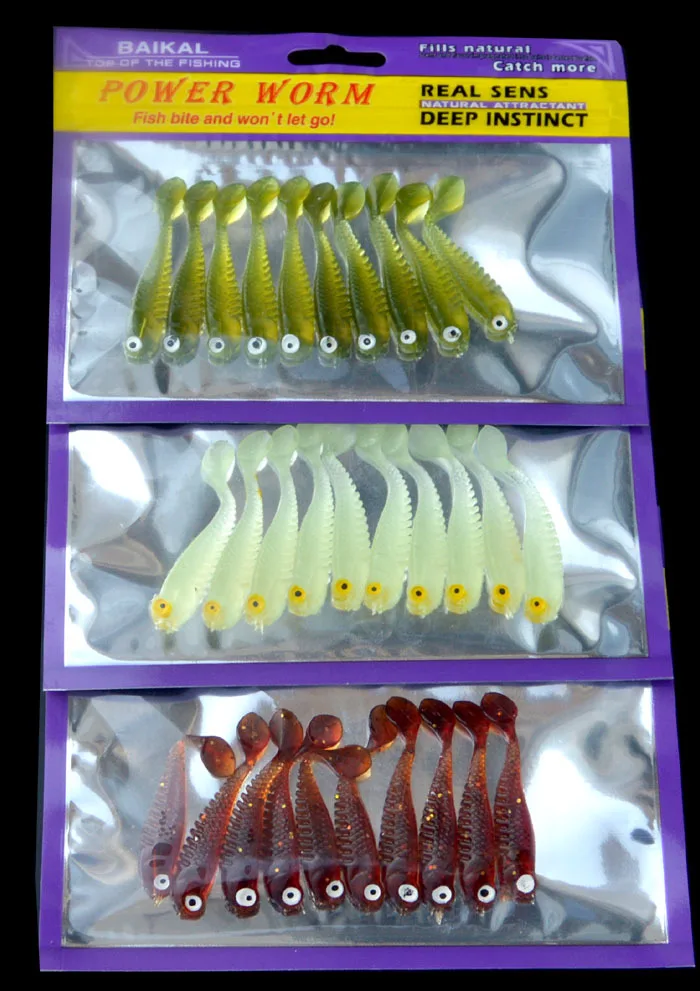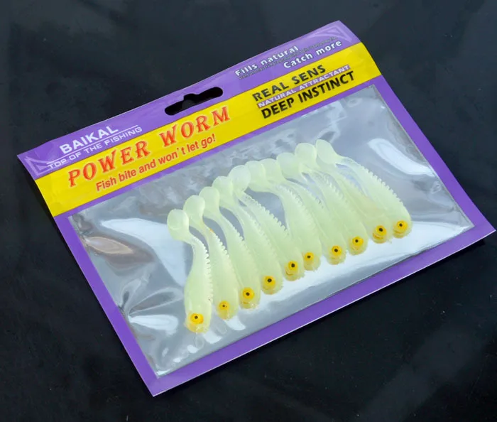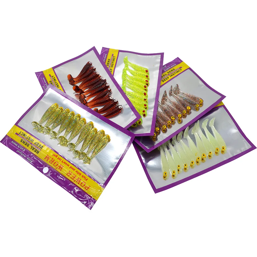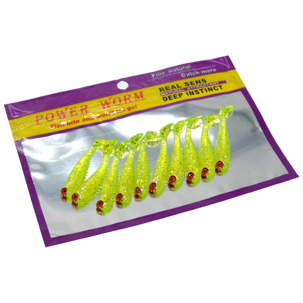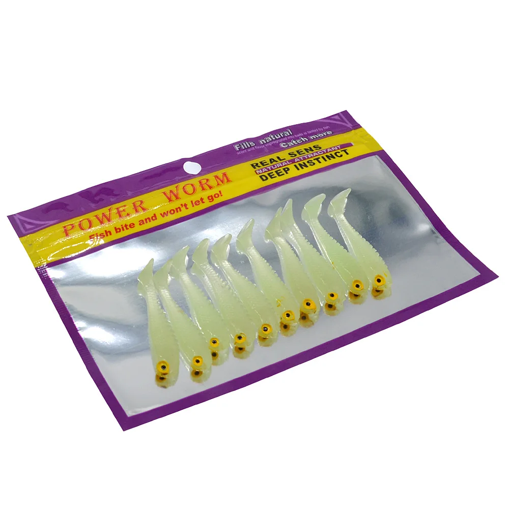 Señuelos artificiales blandos de pez pequeño, 5cm, olor a pescado, verde, morado, brilla en la oscuridad, gusano, 10 unidades por bolsa