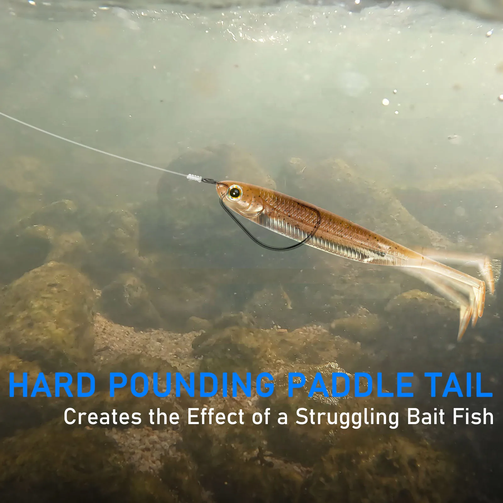 Acción de natación extremadamente realista. Cuenta con una cola de paleta dura para crear patadas y meneos atractivos para volver locos a los peces, atrayéndolos a atacar.