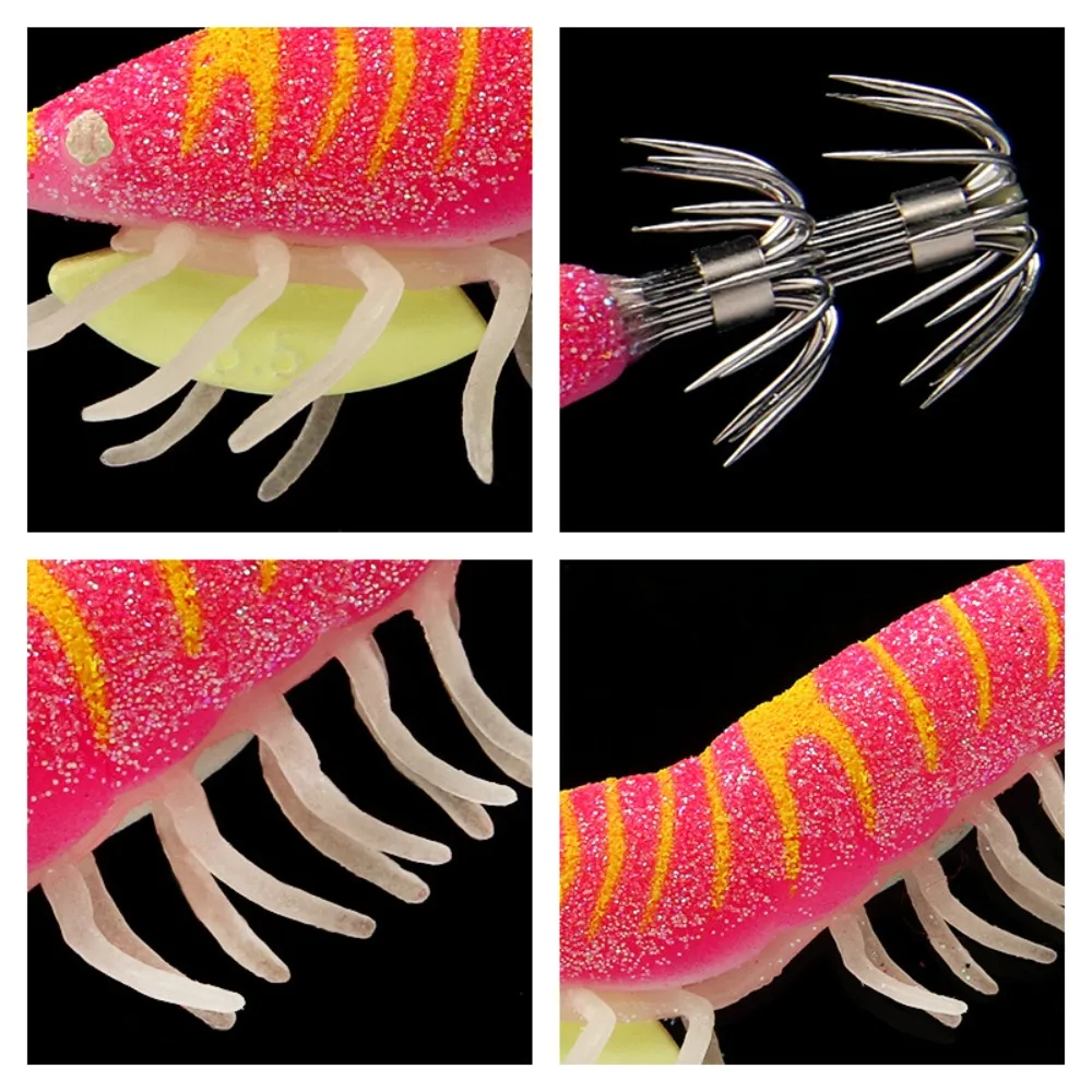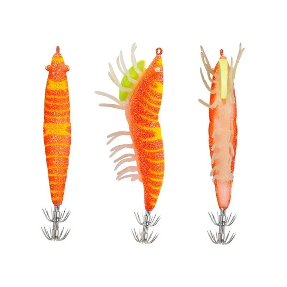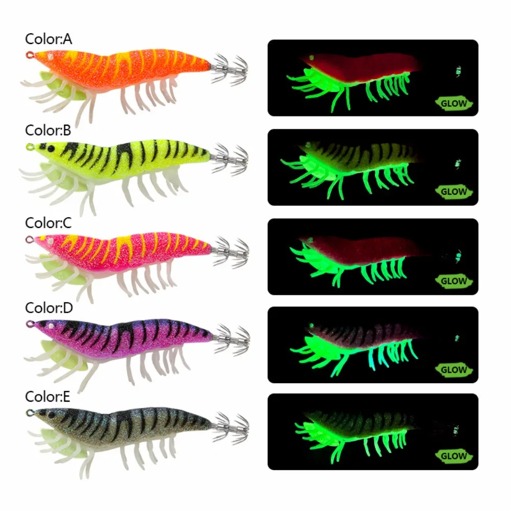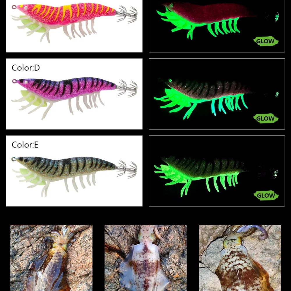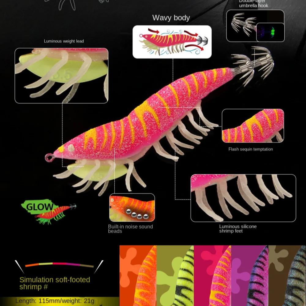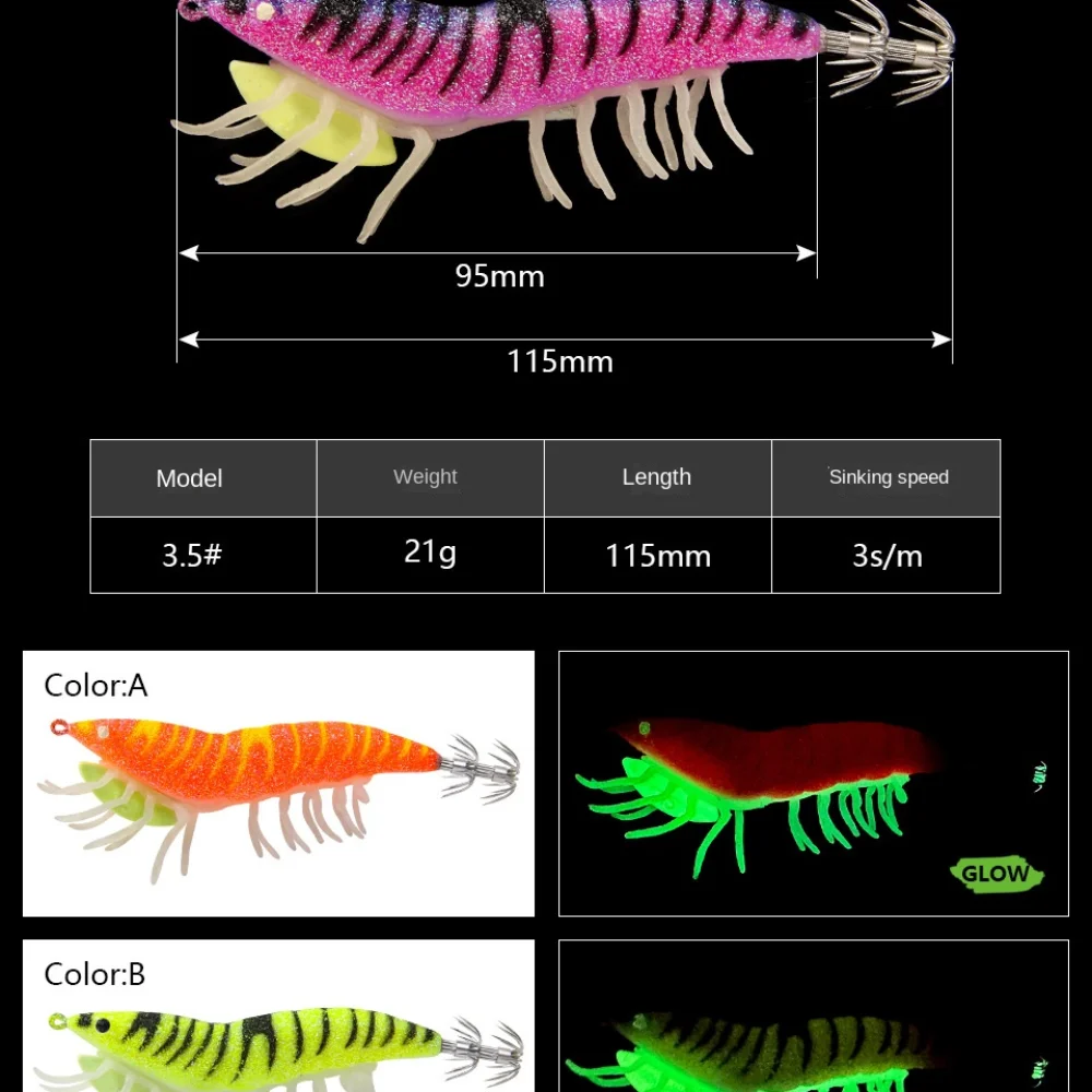 Weight: 21g Length: 11.5cm water: Saltwater Buoyancy: Sinking Sink Rate: 3 to 4 sec/m Diving depth (ft): Variable Hook: Sharp extra strong hooks Feature: 1.This bait features a combination hard and soft body with hand painteddetails and 3D eyes for realism. 2.Built in tungsten ball when dragging , the sound of the tungsten ballhitting is crisp and the sound is more tempting for fish. 3.Flash boost feature, More attractive to target fish attack. 4.Soft tentacles that imitate the movement of real shrimp feet inwater, can emit noctilucent light to lure fish. Package Included: 1pc Shrimp Bait