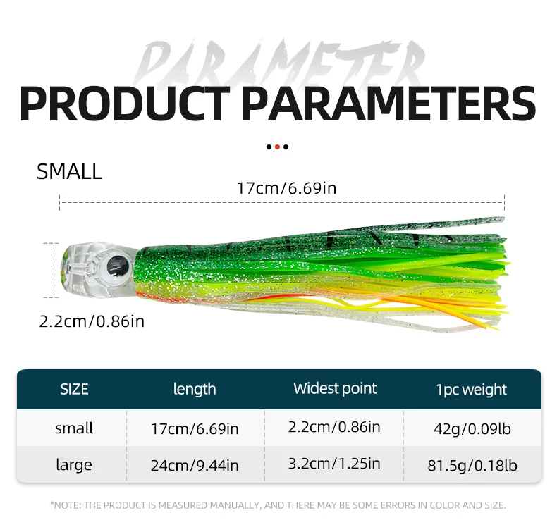 Tamaño del señuelo: 6,5 pulgadas (aproximadamente 16 cm) 9,8 pulgadas (aproximadamente 25 cm).6 colores populares.