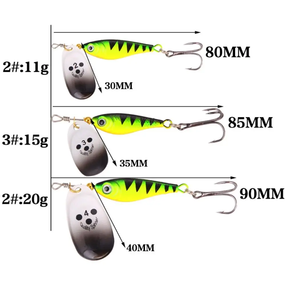 Nombre: cebo giratorio Materiales: pintura láser de metal respetuosa con el medio ambiente Peso: 11/15/20g Longitud del cuerpo: 8/8.5/9cm (3,15/3,35/3,54 pulgadas) El paquete incluye: 1 cebo giratorio VIB Característica: acción realista y rápida en el agua. Excelente efecto visual para atraer peces. El cuerpo colorido puede facilitar la captura de peces.