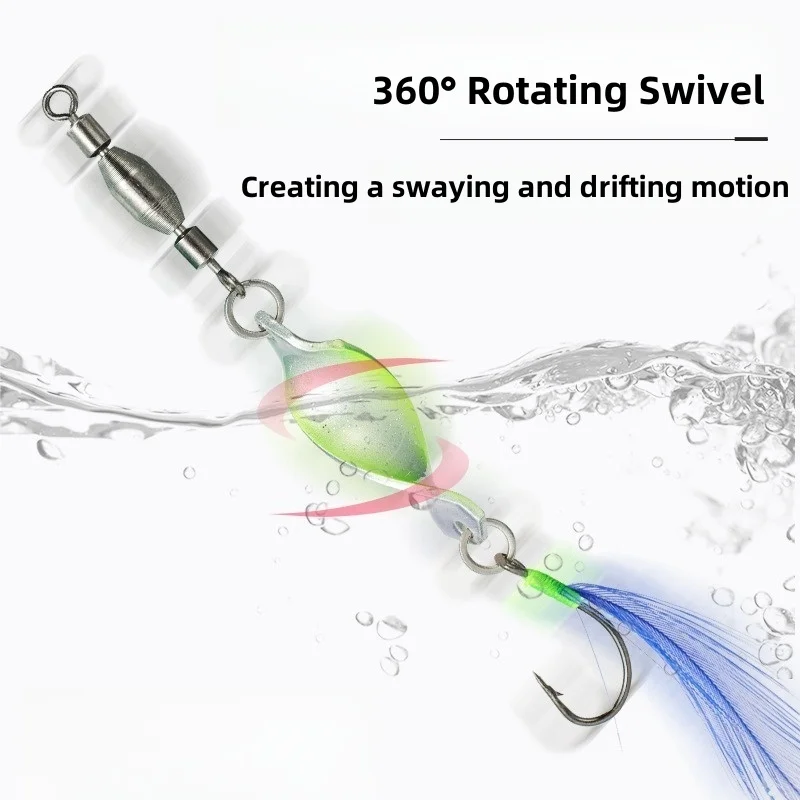 360° Rotación: El giro de latón permite que las cuchillas retorcidas giren 360° en el agua, creando un movimiento oscilante y deriva que genera salpicaduras y reflejos, mejorando la tasa de captura de peces.