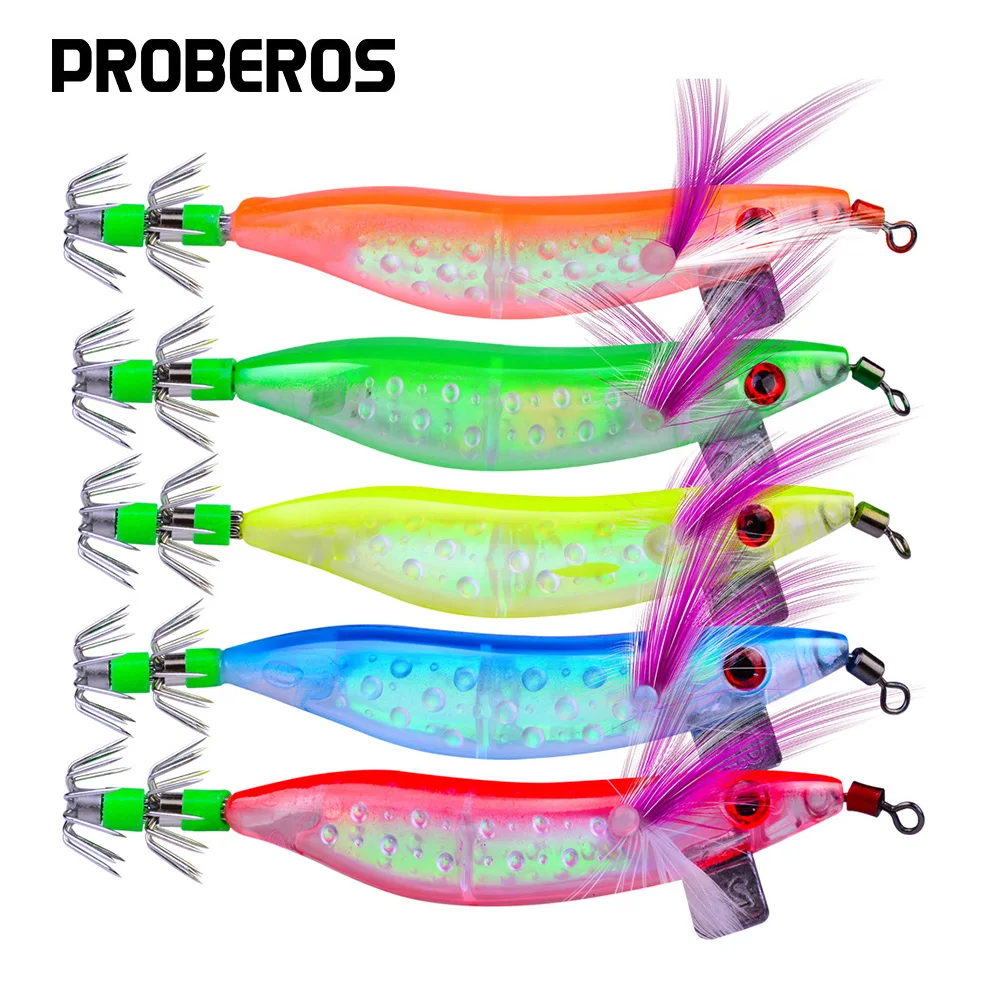 Señuelos luminosos para pesca en agua salada, anzuelos de calamar, gambas, gambas, duros, ojos 3D, cebo brillante falso para sepia y pulpo, 5 piezas