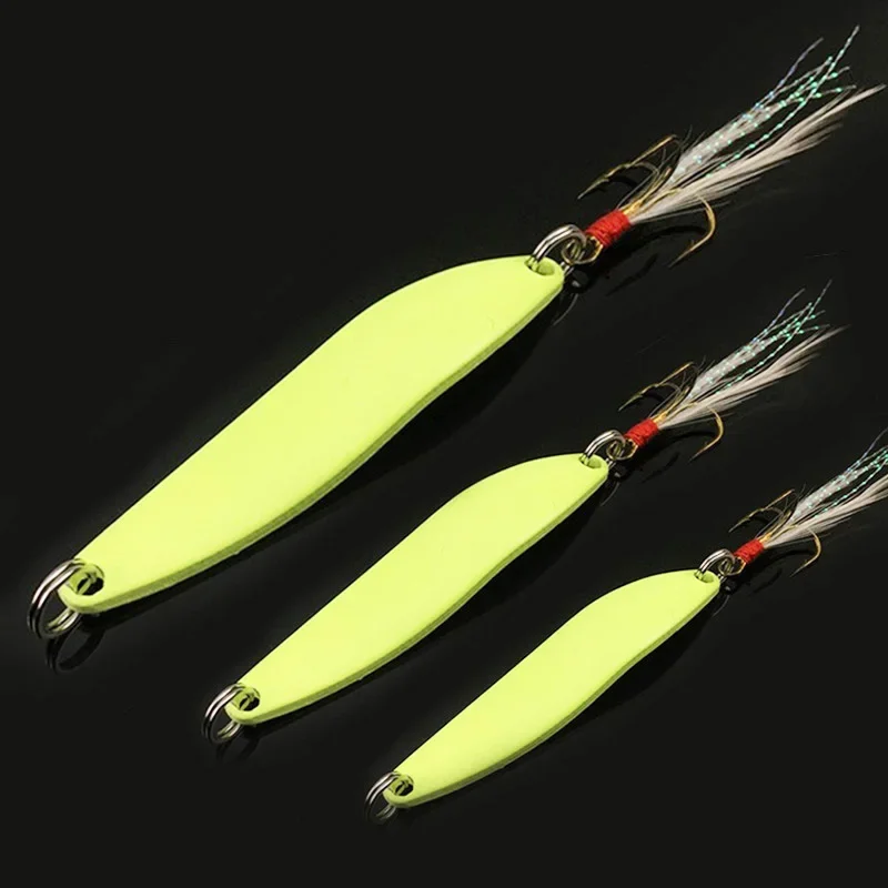 Cuchara giratoria luminosa, señuelos de Metal, 5g, 7g, 10g, 13g, anzuelo triple de plumas, cebo Artificial para lubina, trucha, aparejos de Pesca, 1 Uds.