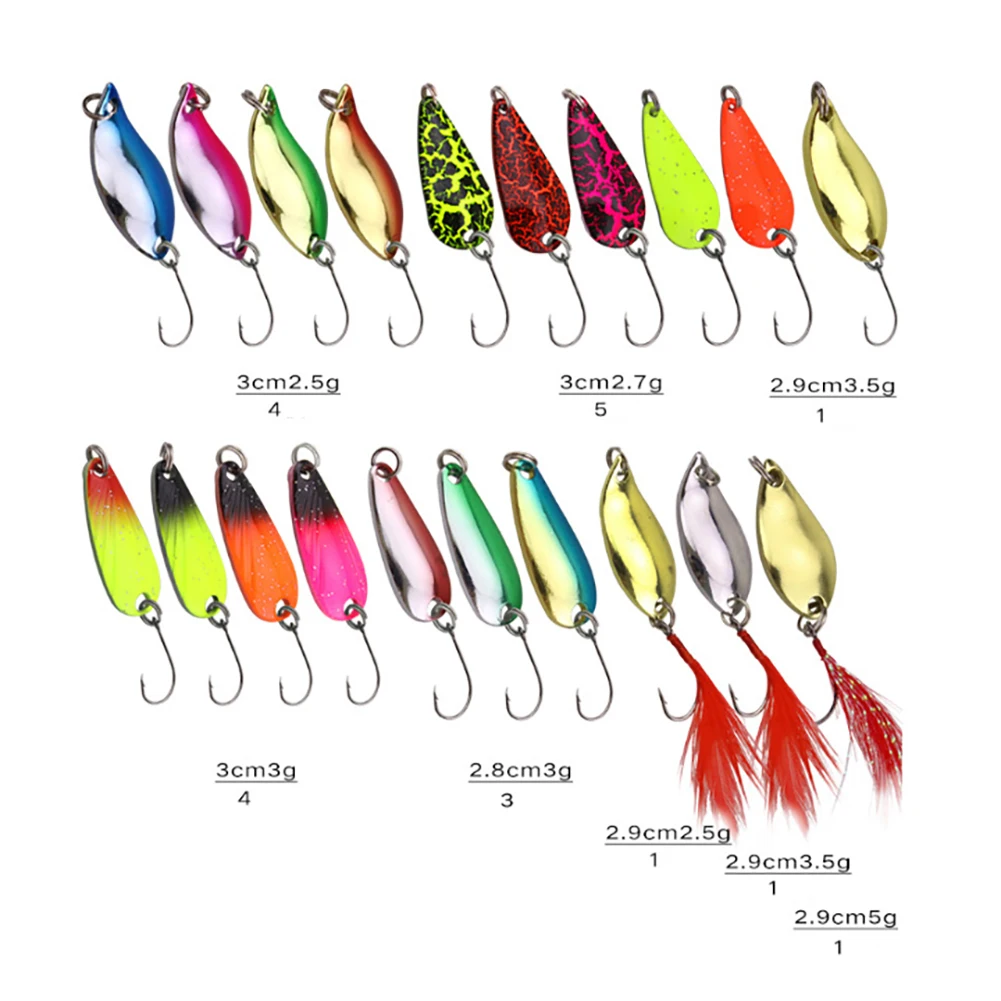 Conjunto completo de cebos: incluye 20 cebos giratorios vívidos y un paquete portátil de cebo giratorio de doble cara, diseñado para actividades de pesca al aire libre convenientes.