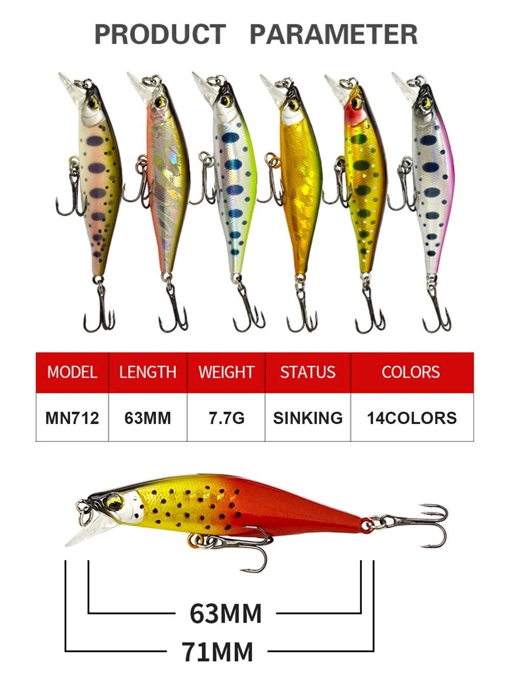 Señuelos de pesca de 6,3cm, 7.7g, hundimiento de pececillo Wobbler, cebo duro Artificial de fundición larga, accesorios de pesca Jerkbait, trucha, lubina MN712