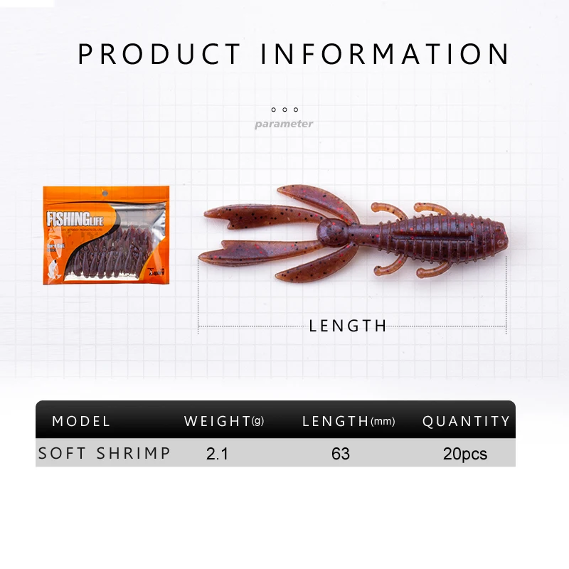 Señuelos de Pesca de 63mm/20 piezas, 2,1g, señuelos blandos de pesca de camarón, Señuelos de Pesca de plástico suave, Superco