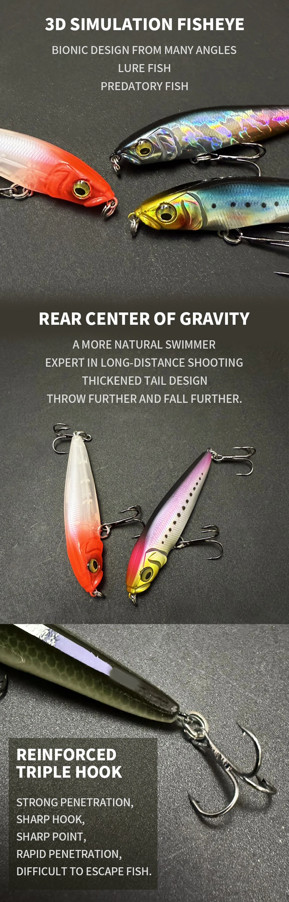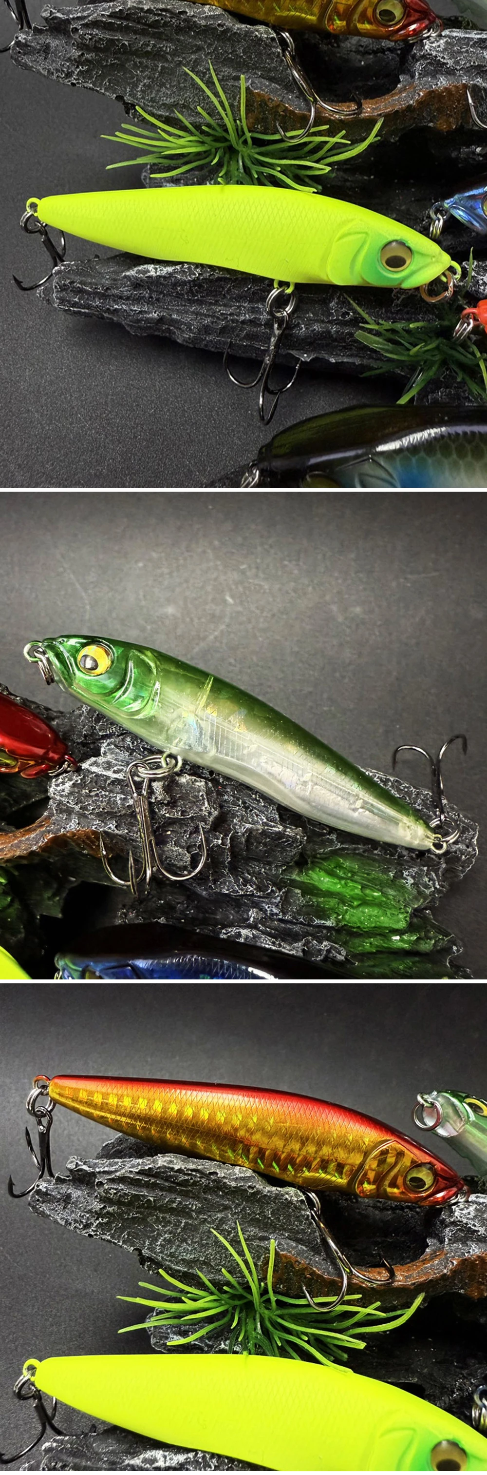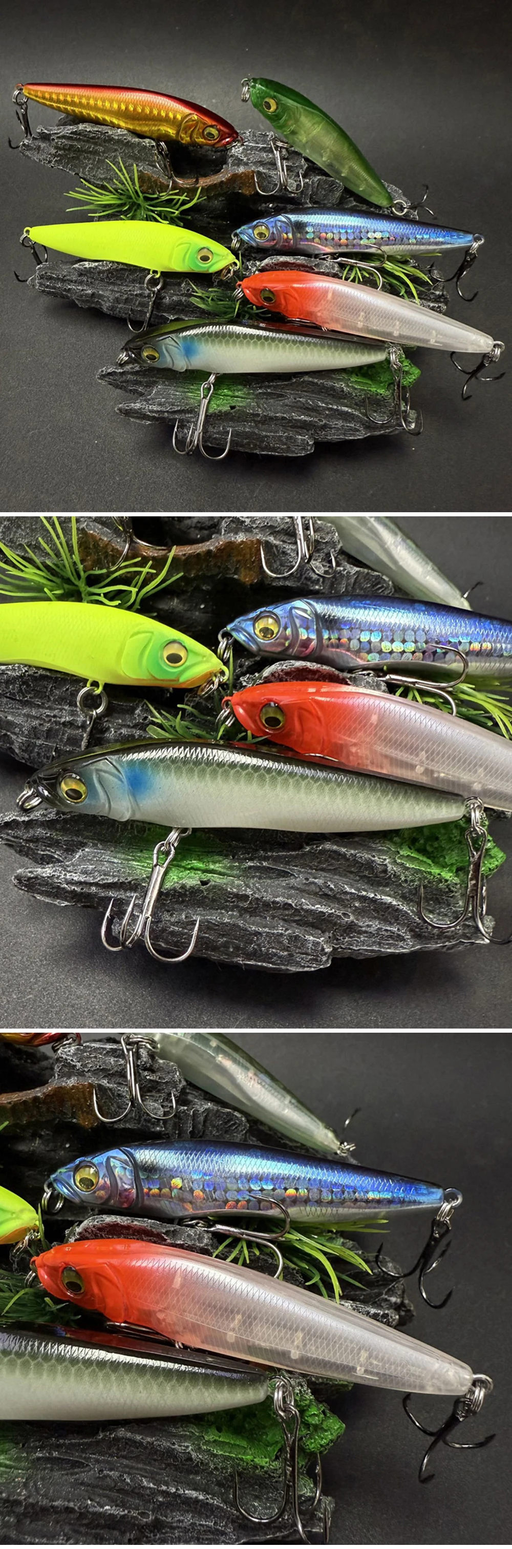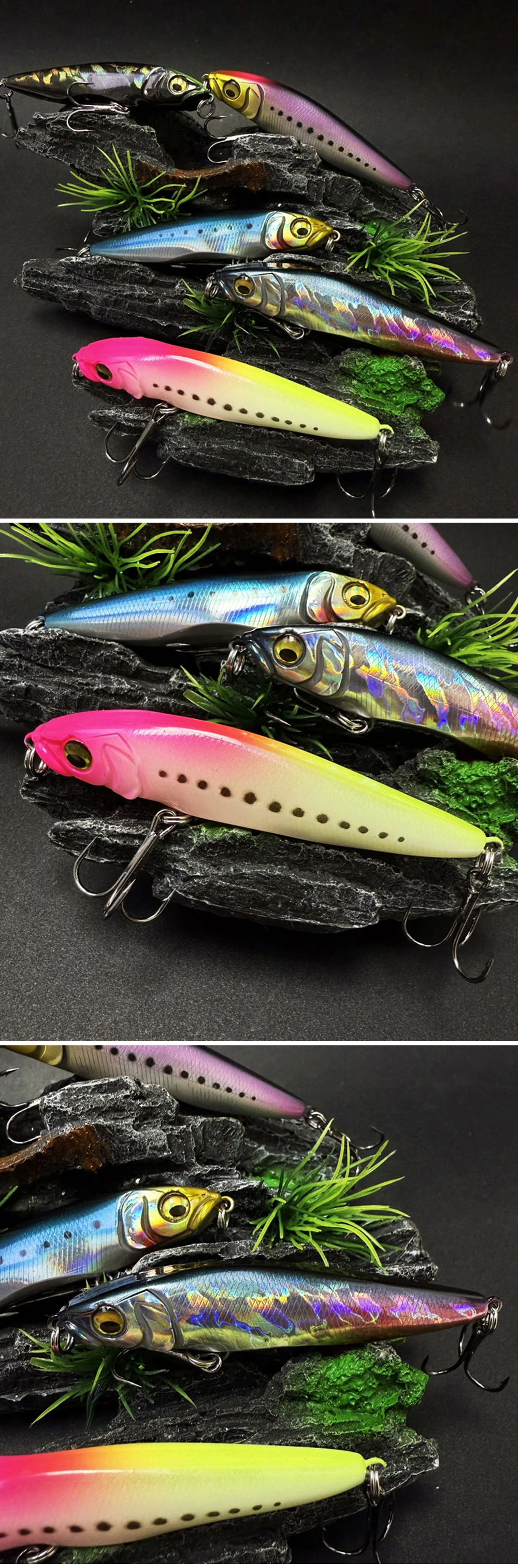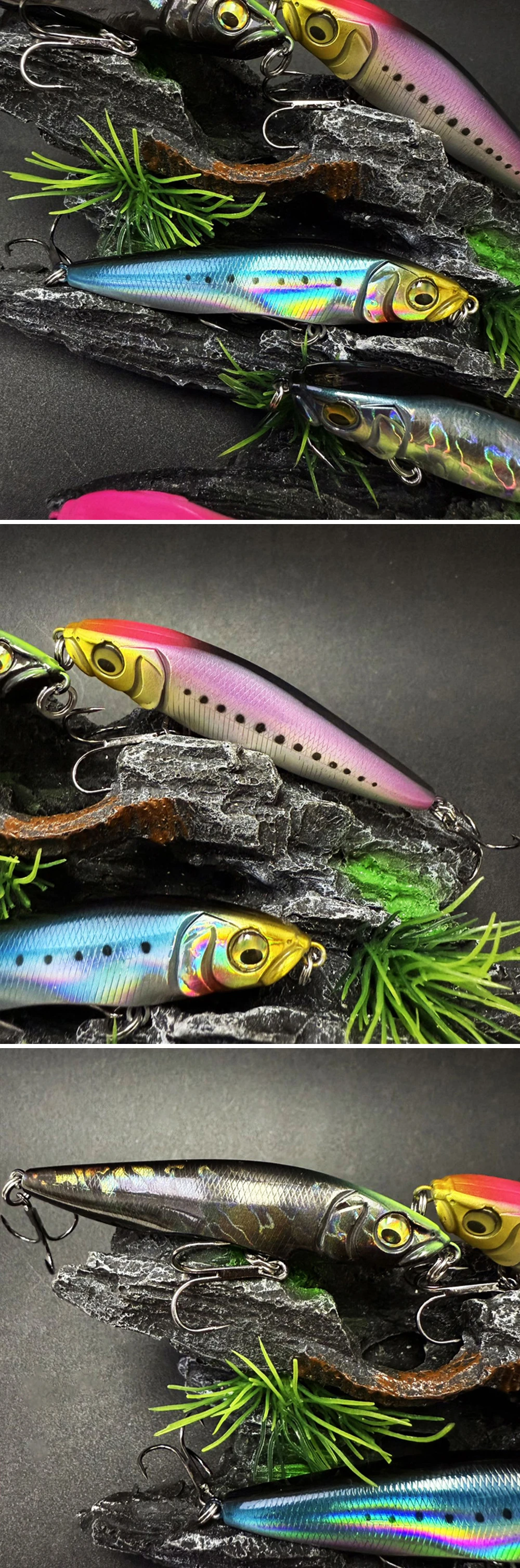 3. Los cebos tienen una pintura realista y ojos 3D vívidos, hacen que el cebo parezca peces reales nadando en el agua durante la pesca.