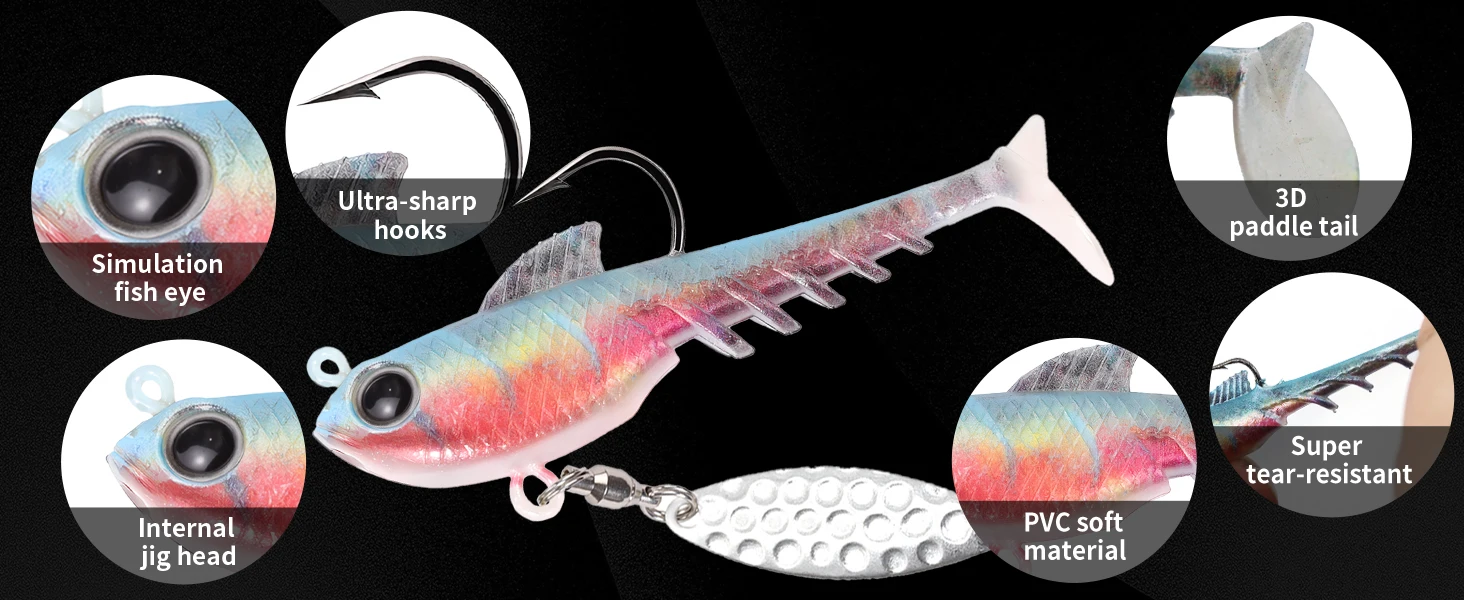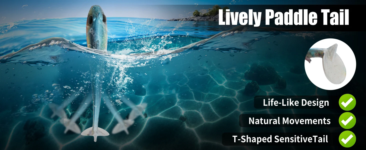 Los señuelos de pesca de lubina tienen una cola en T 3D que ofrece un giro flexible y fuerte que crea una acción de natación natural en el agua.El gancho superior protege contra colmillos.