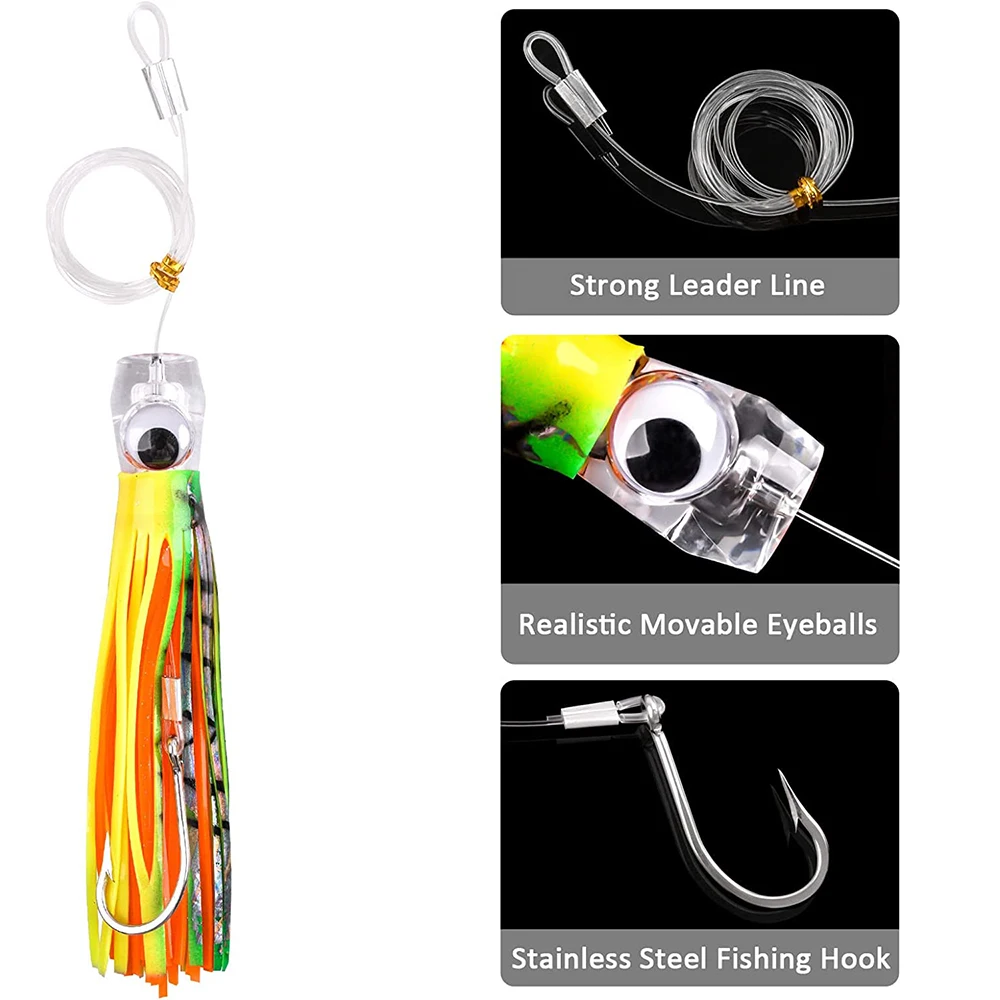 1. Cabeza acrílica con peso de plomo en el interior, ojos 3D, salpican flores de agua al curricán a alta velocidad y el señuelo se mueve vívidamente como peces reales.