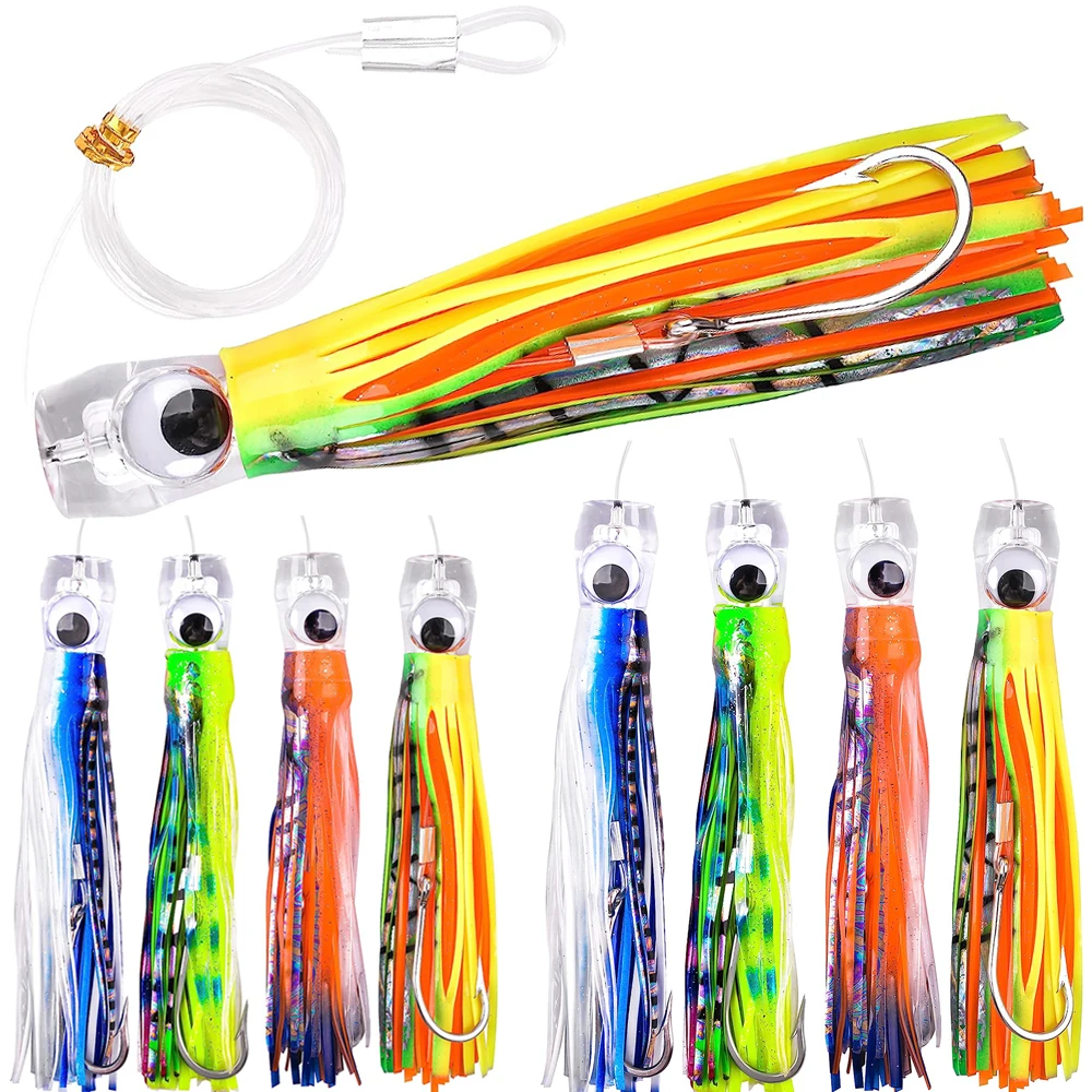 1. Cabeza acrílica con peso de plomo en el interior, ojos 3D, salpican flores de agua al curricán a alta velocidad y el señuelo se mueve vívidamente como peces reales.
