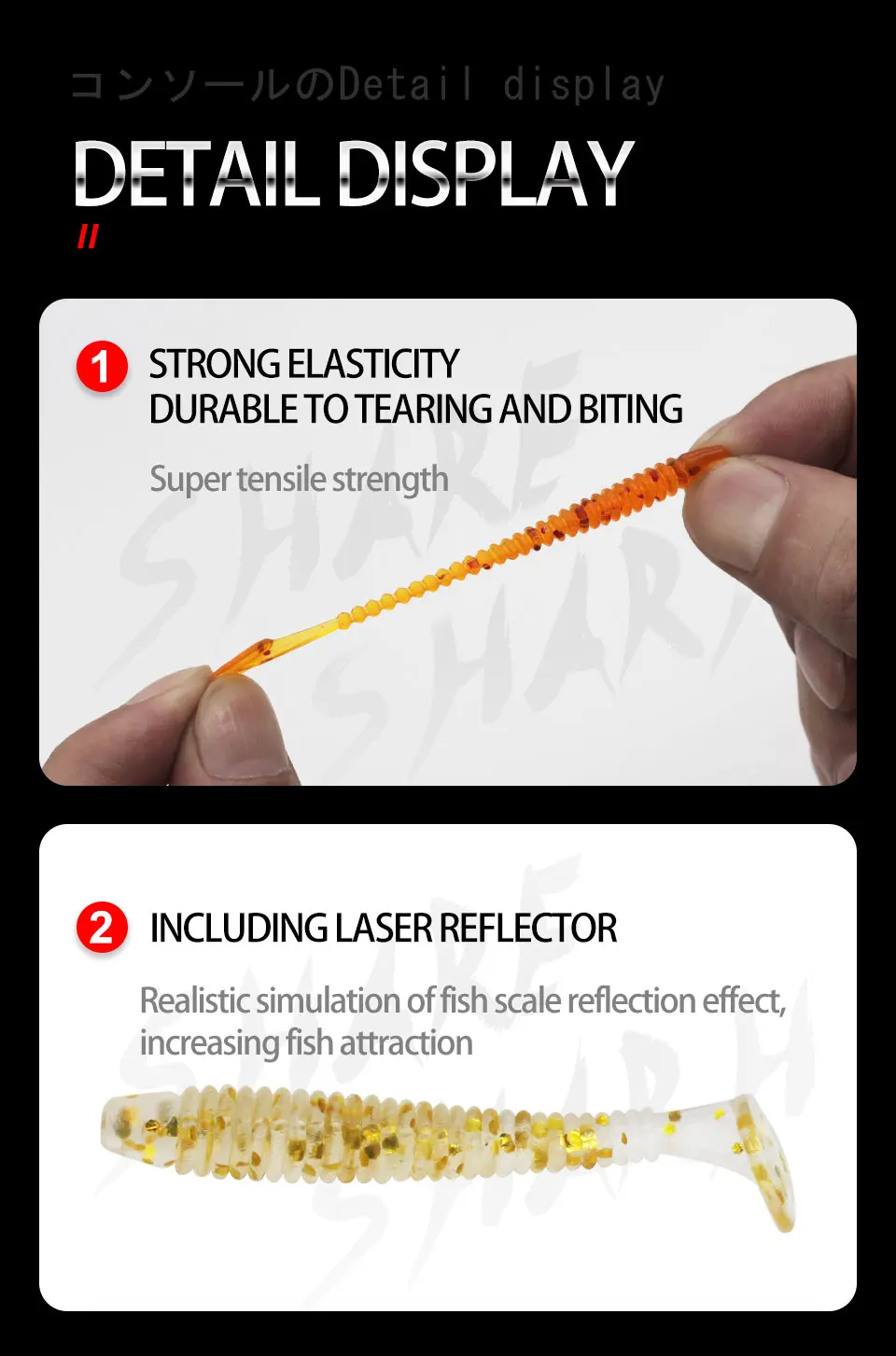 【Parámetros】:【Aplicable a】:Estos cebos de pesca de plástico blando se pueden pescar con un anzuelo de natación con peso, un cebo giratorio o giratorio, un anzuelo con cabeza Jig o gusano, un anzuelo con espacio amplio.