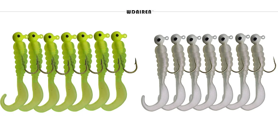 WDAIREN 7 unids/lote Señuelos de Pesca con señuelos suaves 5cm 2,8G volumen cola señuelo Jig cabeza de plomo cebo suave agua salada/Pesca de carpa de agua dulce Cantidad: 7 unids/lote Longitud: 5cm Peso: 2,8G Características: Estos señuelos son muy suaves, se pueden conectar fácilmente al anzuelo. Hay 7 ganchos de cabeza de plomo y 7 cebos blandos. Adecuado para peces: bagre, lubina, Calderón, platos Terek, pez Bambusa, pez mandarín, etc. El paquete incluye 1x7 Señuelos de Pesca