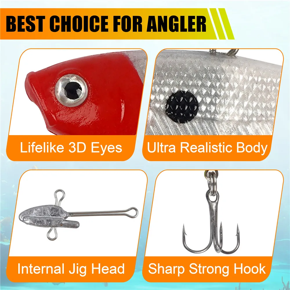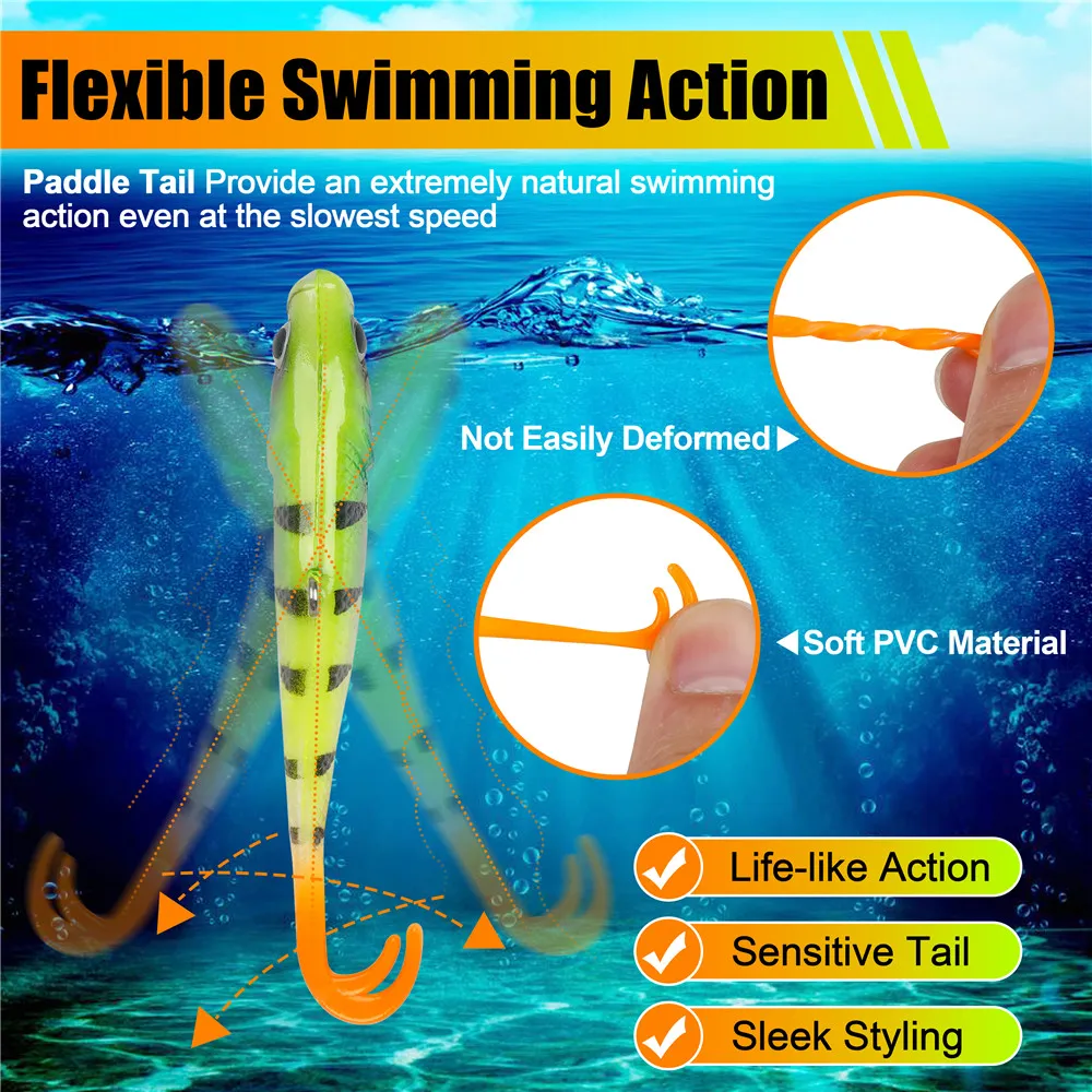 3. El cebo suave es un cebo de cola de paleta versátil con lentejuelas incorporadas y señuelo que brilla en la oscuridad, perfecto para todas las situaciones. Es ideal para lubina, trucha, lucioperca, Lucio, salmón, gallineta nórdica y más en arrecifes, estuarios, ríos, agua dulce o salada. Su diseño artístico también lo convierte en un gran regalo navideño.