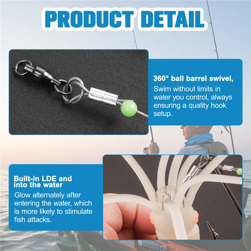 Ball barrel swivel, Braid steel wire and 6/0 Hook. Swim like no limit in the water within your control. It is sturdy and durable.