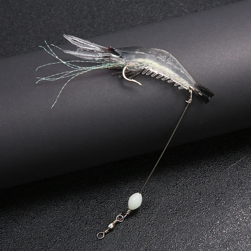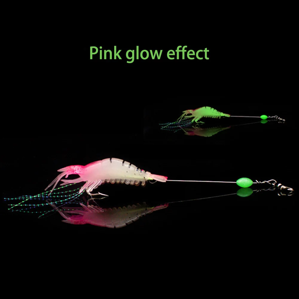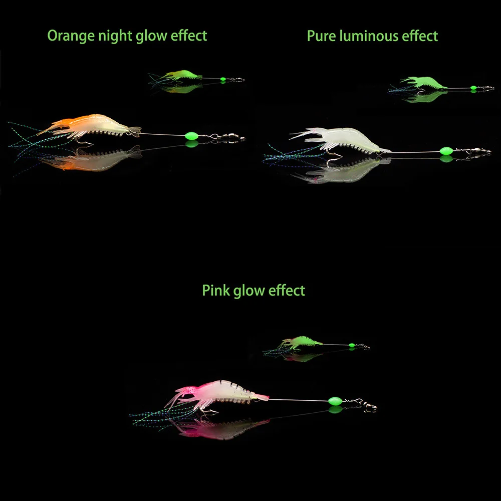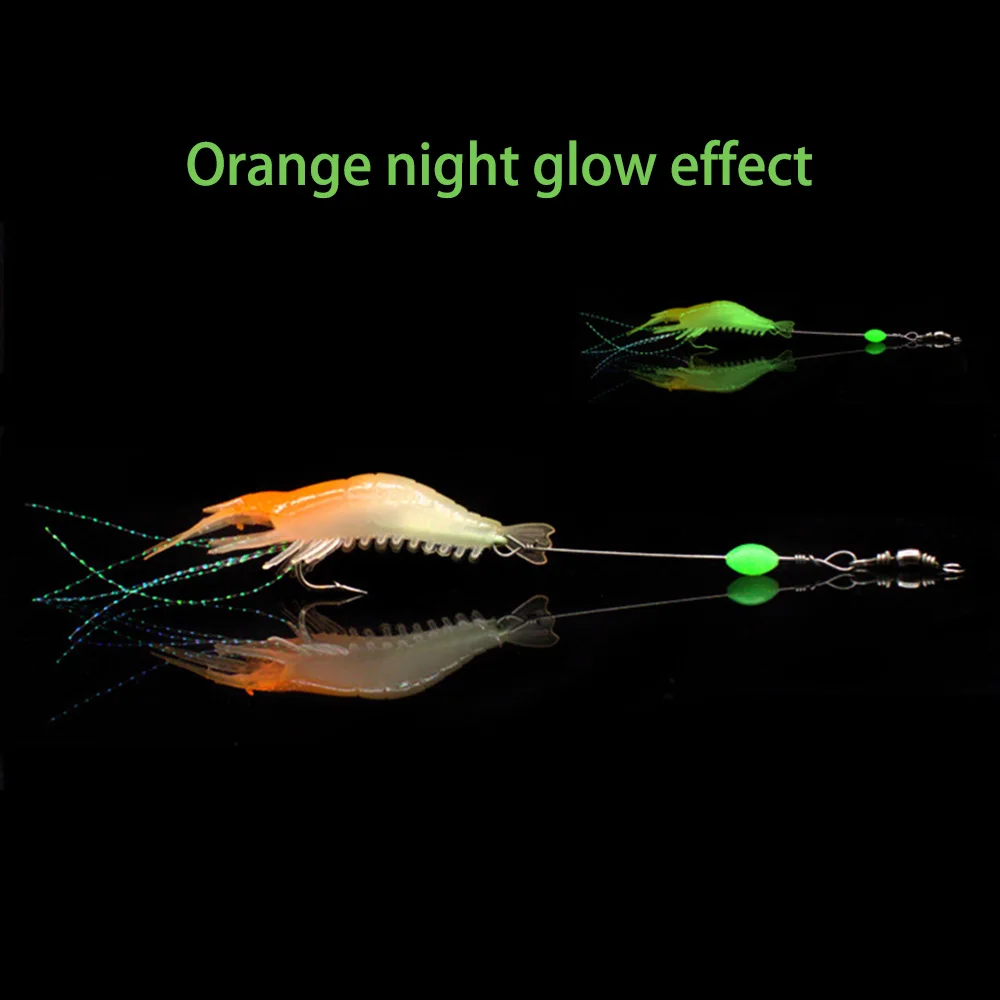 GLOW IN THE DARK SRIMP:Se puso material fluorescente en el anzuelo interior del cebo de Camarón, compatible con la pesca nocturna, bonito regalo para los amantes de la pesca