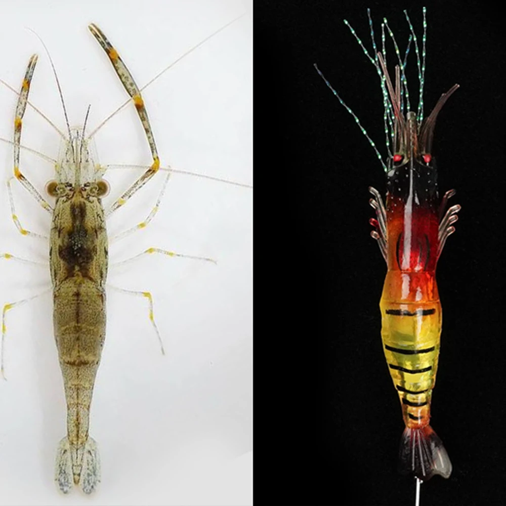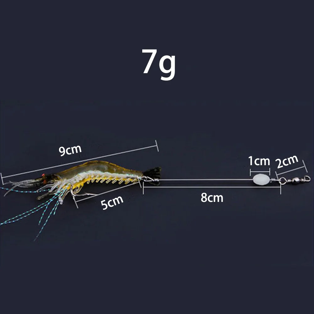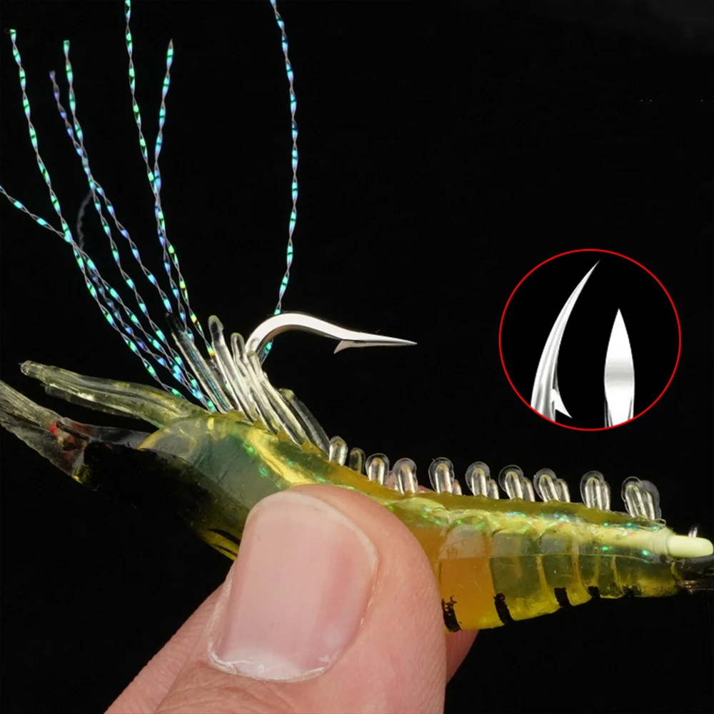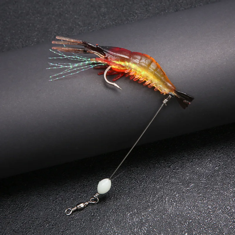 GLOW IN THE DARK SRIMP:Se puso material fluorescente en el anzuelo interior del cebo de Camarón, compatible con la pesca nocturna, bonito regalo para los amantes de la pesca