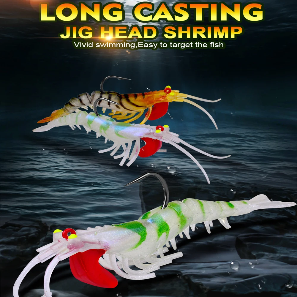 Señuelos de pesca de camarones blandos brillantes realistas con anzuelos afilados, cebo Artificial para agua dulce y salada, señuelos de plástico blando, 1 unidad