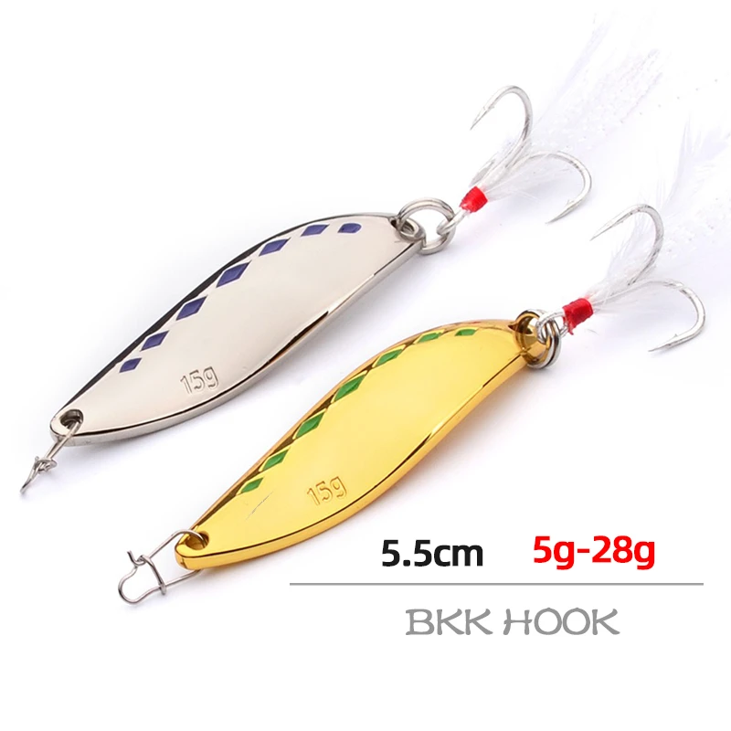 Señuelos de Pesca con cuchara giratoria de Metal, cebo Artificial de oro y plata de 5G-28G con pluma, gancho triple, trucha, Lucio, aparejos de lubina, 1 unidad