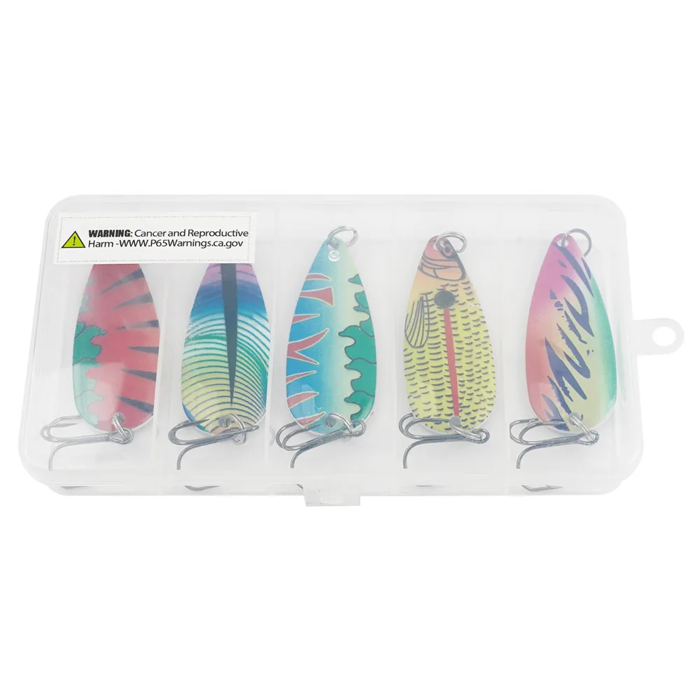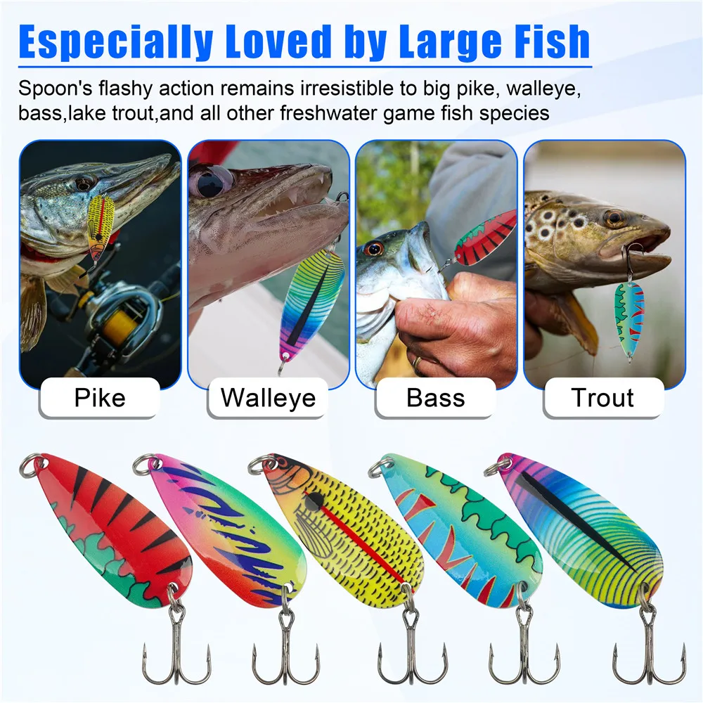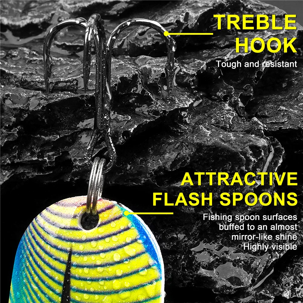 2.Las cucharas de pesca con material altamente reflectante de primera calidad que muestran un efecto reflectante vívido y los colores son vibrantes.El pescador sólo necesita cambiar las cucharas de pesca, dependiendo de la hora del día y las condiciones de pesca.El señuelo de pesca está hecho de material de alta calidad, resistente al óxido y duradero.Debes mantenerlo en condiciones secas.Muchas opciones de color y una gran acción definitivamente te traerán una sorpresa.