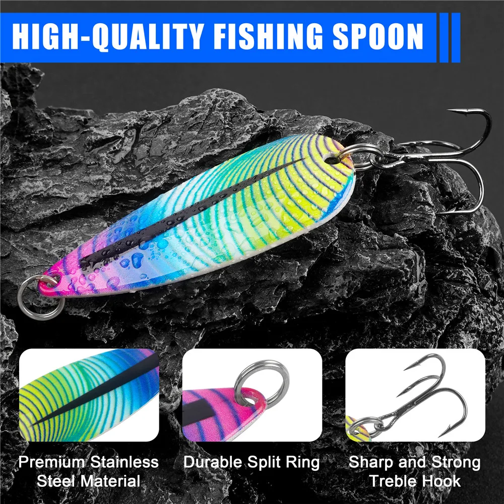 3. Las cucharas de pesca premium tienen múltiples usos. Ideal tanto para agua dulce como salada, lubina con boca grande, pesca en roca, trucha, lucio, bagre, walleye, bluegill, cabeza de robo, etc. A estos peces les encanta, ya sea que estés lanzando, corraando o jigging. Las cucharas de agua salada serán muy efectivas para que los pescadores puedan personalizar la distancia del lanzamiento y la profundidad del recorrido.