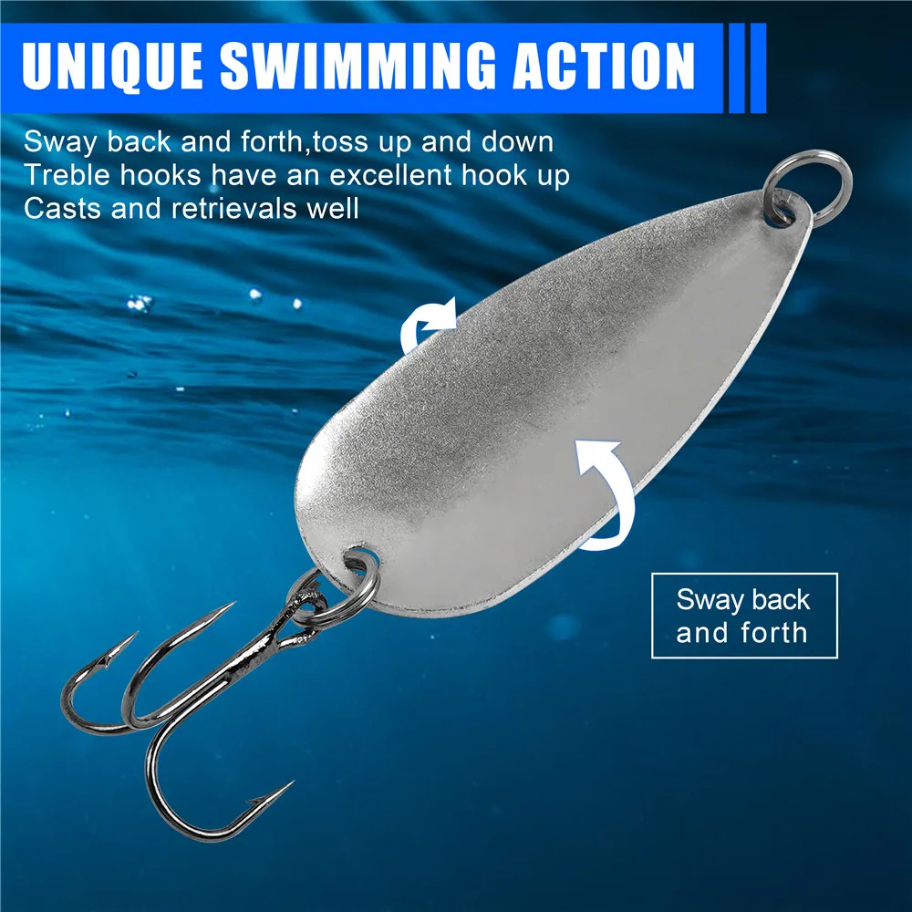 1.Las cucharas de pesca tienen un diseño ovalado, aunque tienen una forma simple, lanzan y recuperan bien.El señuelo de pesca se balancea hacia adelante y hacia atrás, se lanza hacia arriba y hacia abajo, lo que refleja una postura de natación realista.Estas cucharas de pesca atraen una postura vívida y natural como los peces pequeños cuando nadan en el agua, por lo que pueden atraer a los peces para que ataquen.