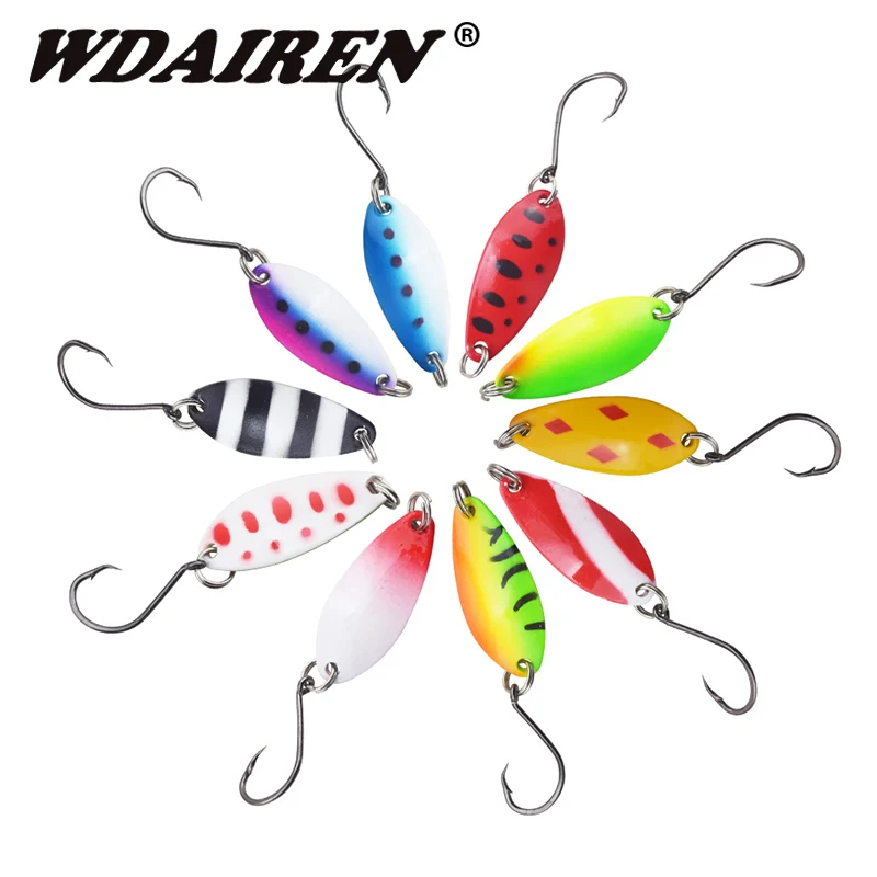 Marca: WDAIRENTipo de señuelo: cebo de cuchara de metalLongitud: 40mmPeso: 6,3gColor: 10 colores diferentesMaterial: aleación de zincGancho: Gancho único afiladoLista de embalaje:10 Señuelos de Pesca