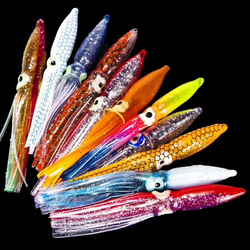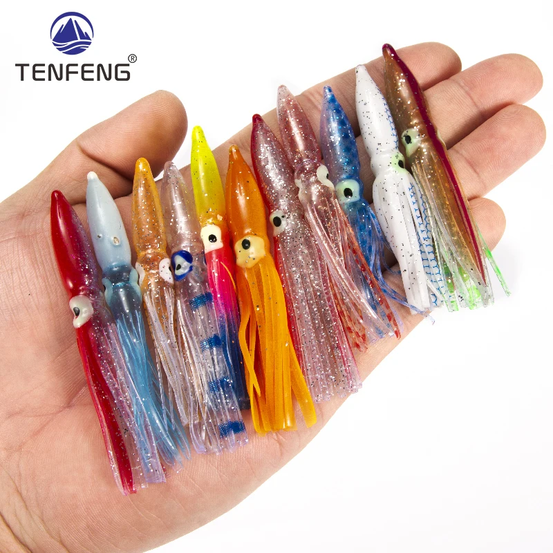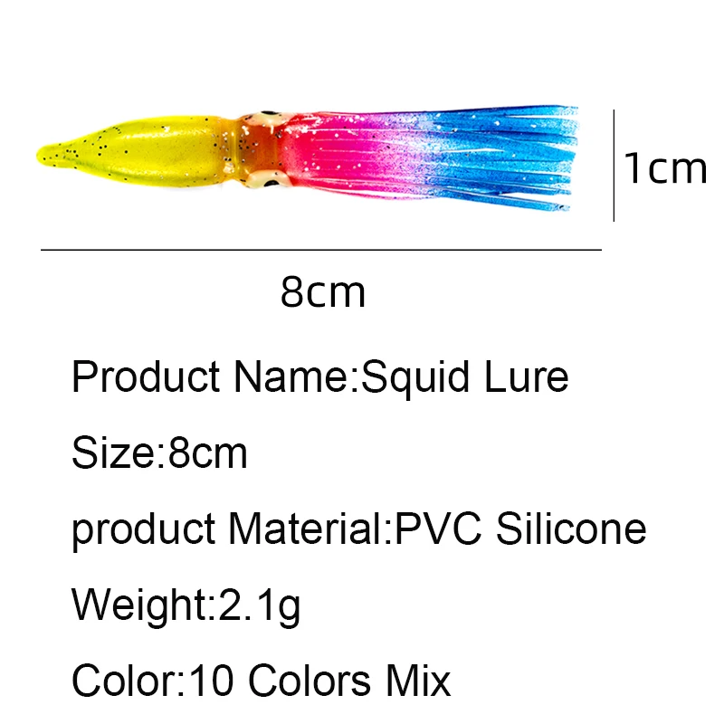 Señuelos de Pesca de faldas de calamar suave, cabeza de Jigs de PVC, sábalo de silicona Artificial, aparejos de Pesca, 8cm, 10 Uds.