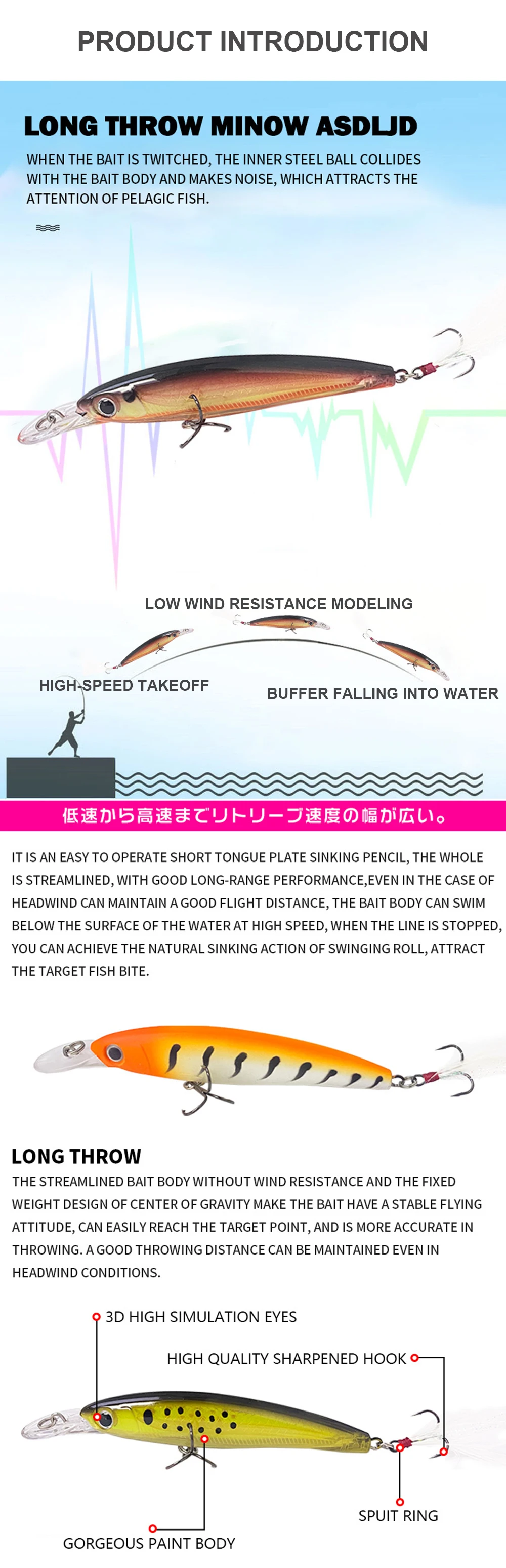 6. Bolas de metal: Bolas de acero inoxidable en el interior, para mantener el equilibrio del señuelo de pesca, para la mayor distancia de lanzamiento.