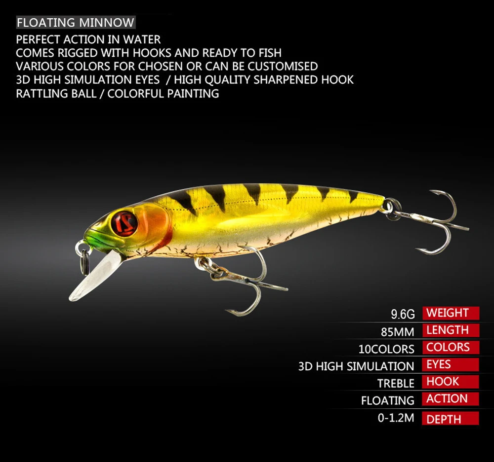 8,5 cm 9,6G Señuelos de Pesca Flotante Minnow Wobbler Long Casting Artificial Cebo duro Jerkbait Accesorios de pesca Trucha Bass MN627