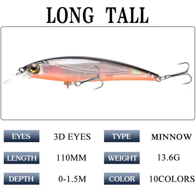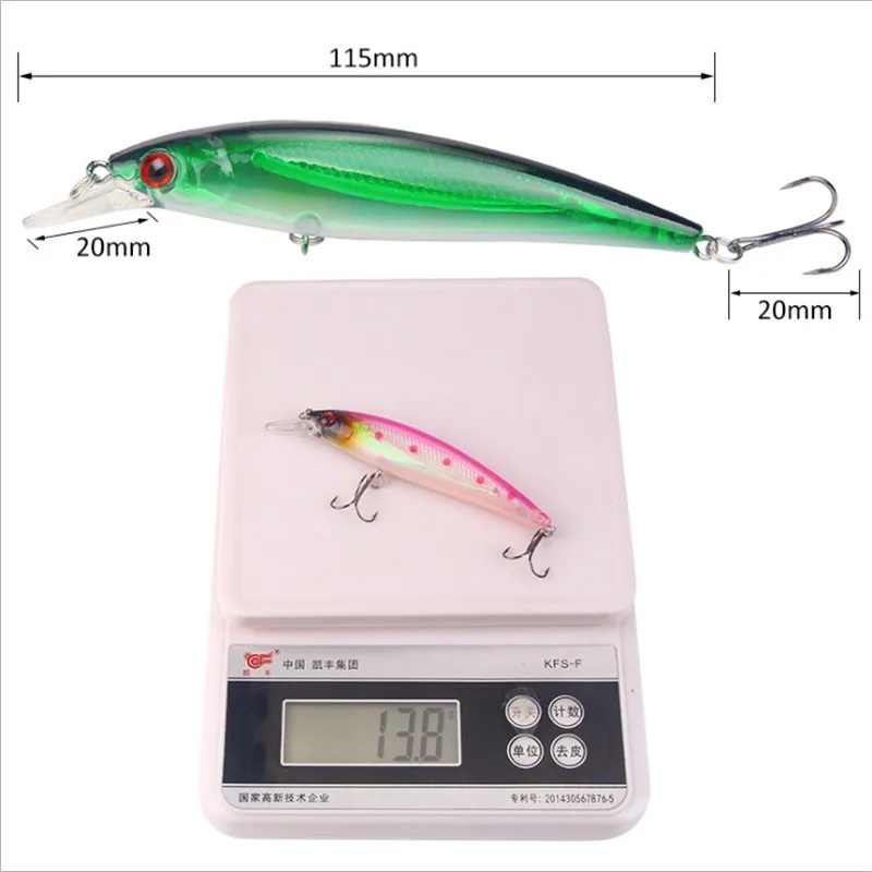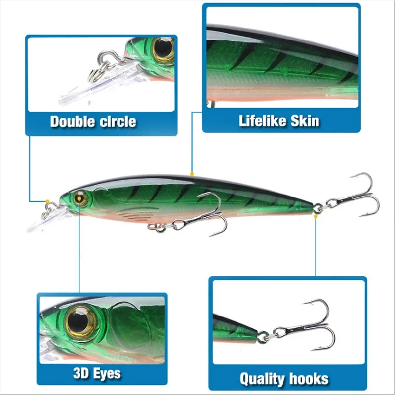 Características: Los ojos 3D lo convierten en una herramienta perfecta para los amantes de la pesca. El cuerpo colorido puede facilitar la captura de peces. Acción realista y rápida en el agua. Excelente efecto visual para atraer peces. Color : 10 colores Longitud: 110mm Peso: 13,5G Profundidad de buceo: 0,5-2M Material del producto: plástico Ojos (ojos): ojos 3D Embalaje: bolsa OPP Nota: Tamaño para la medición manual, puede haber un error de 0 a 1 cm, pertenece al fenómeno normal Debido a la diferencia entre monitores, es posible que la imagen no refleje el color real del producto. ¡Gracias!