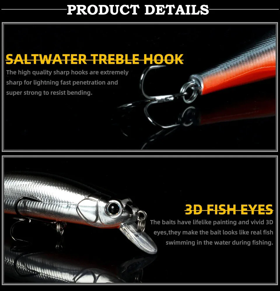 1. Haga que el cebo cobre vida con ojos 3D vívidos, haga que el cebo parezca un pez real y muestre una mejor postura de natación en el agua al pescar.
