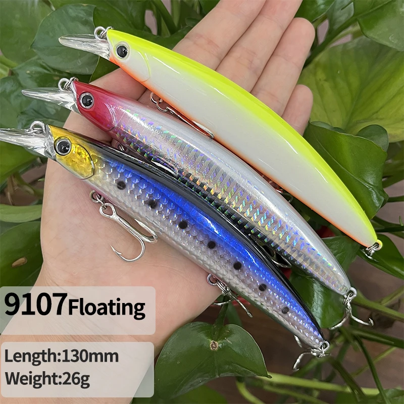 1 Uds 130mm 23g Minnow flotante fundición larga cebo Artificial de plástico duro señuelo de trucha de agua salada accesorios de pesca Wobbler 9107