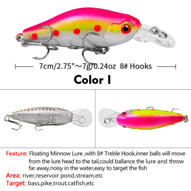 Señuelos de pesca de Minnow flotantes, cebos duros artificiales de 70mm y 7g, cebo de manivela para Lucio, lubina, Crankbait, aparejos de Pesca, 1 Uds.