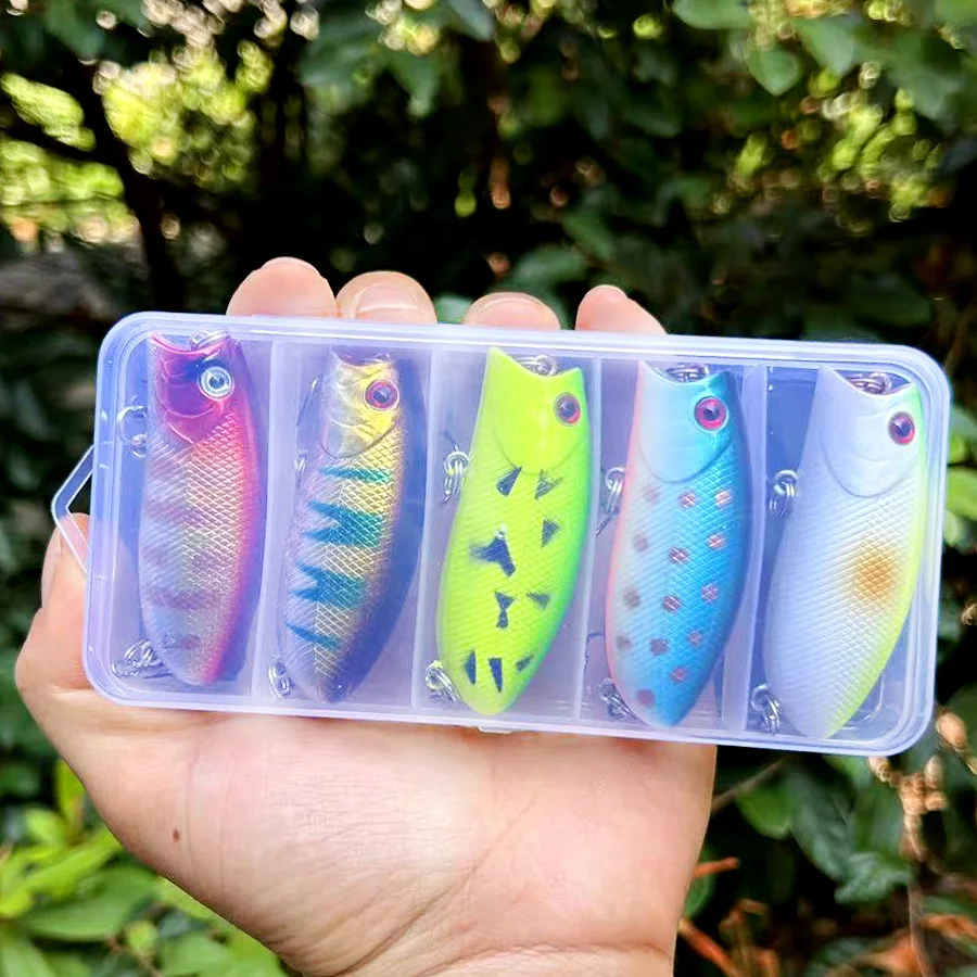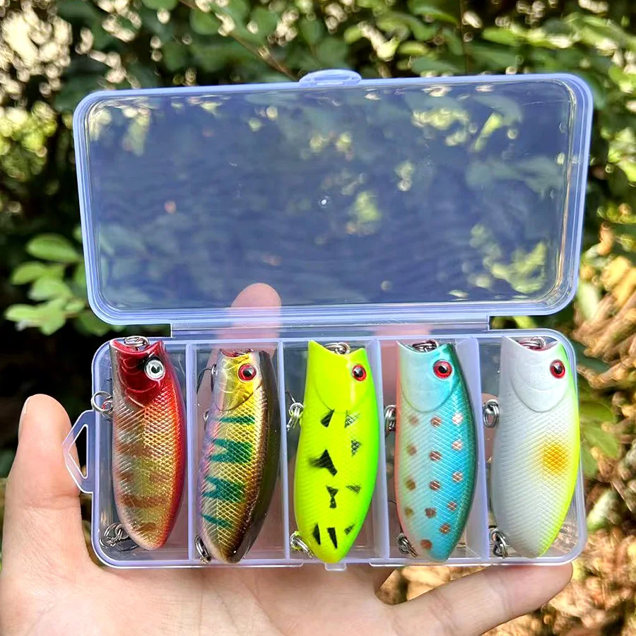 Señuelos de Pesca flotantes Popper Crankbait, Wobblers Topwater, aparejos de pesca, cebo Artificial, Lucio duro, carpa, Swimbait, 5 unids/lote por caja